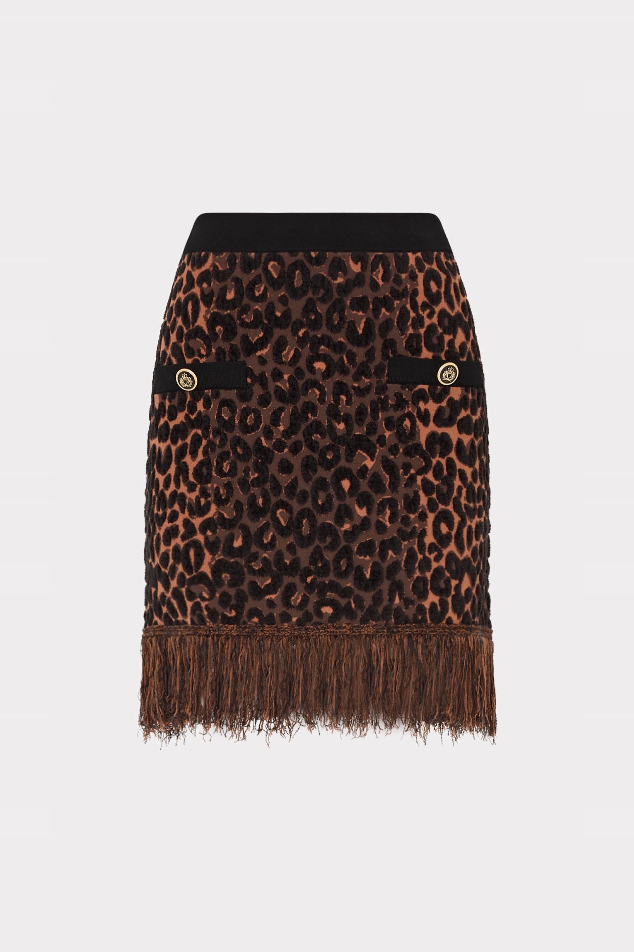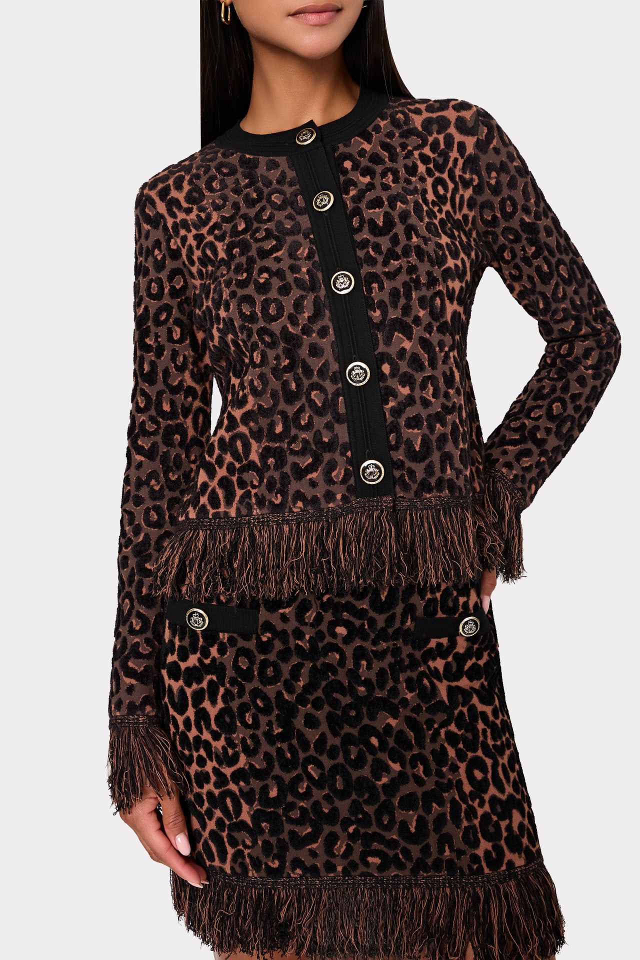 Crafted from heavy knit fabrication with tons of stretch, this leopard print mini skirt is adorned with prim pocket details, military-style gold buttons at the hip, and fringe at the hemline. For the full look, pair it with its coordinating Kaia Fringe Cardigan jacket.