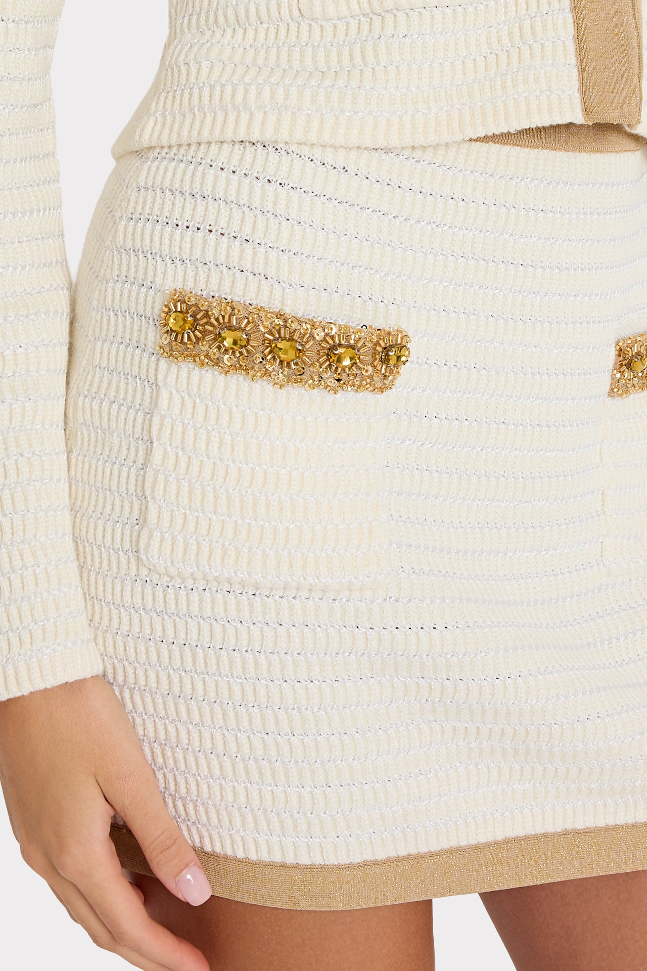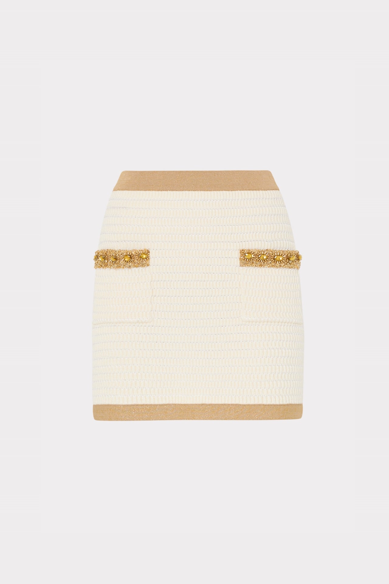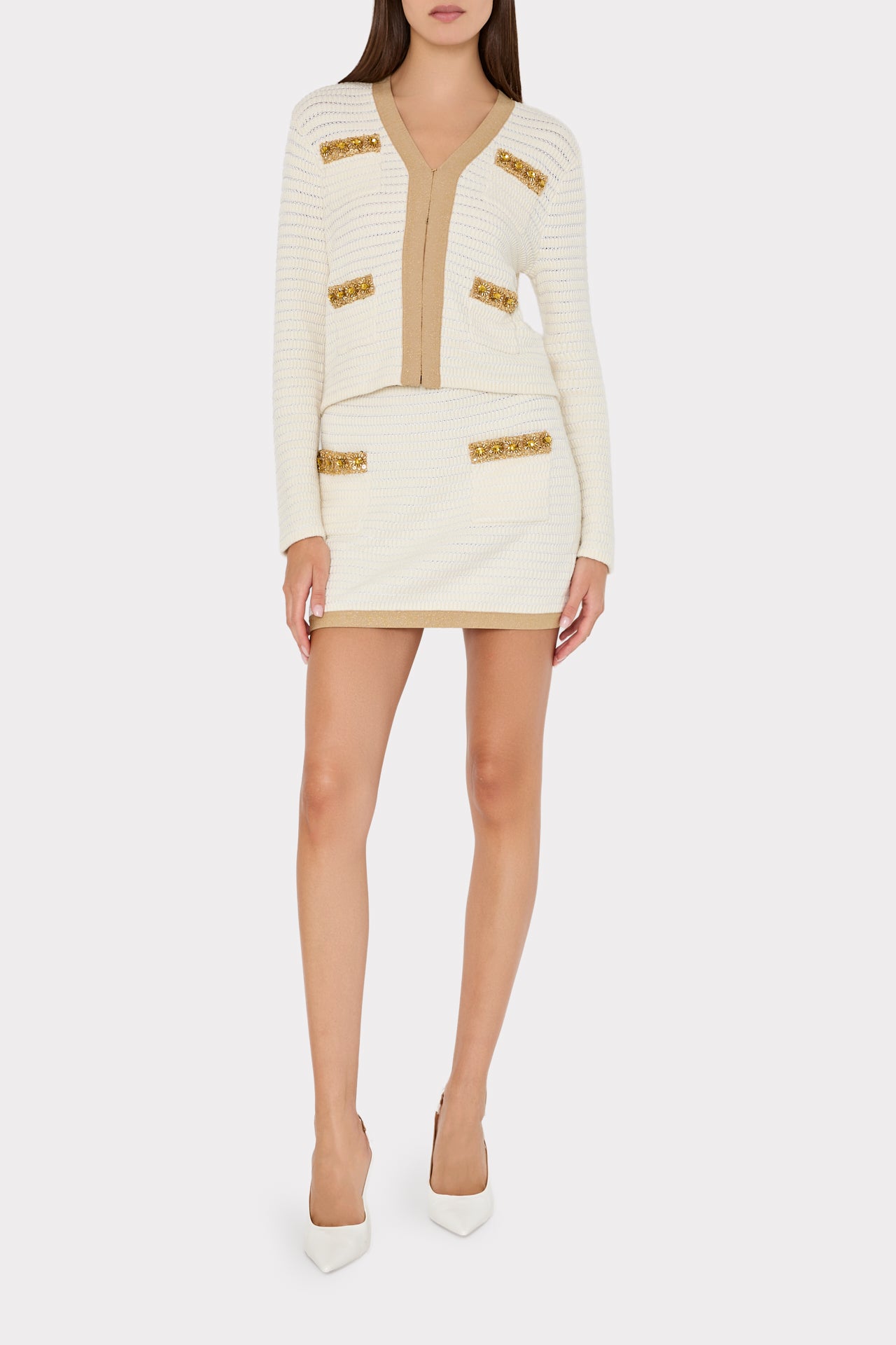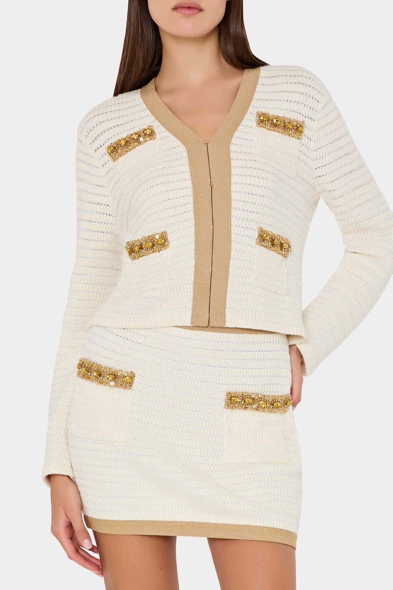 The Reggie skirt is cut from a textured woven material that’s embellished with gold trim and sequins. For the full look, wear it with its coordinating Reid Cardigan.