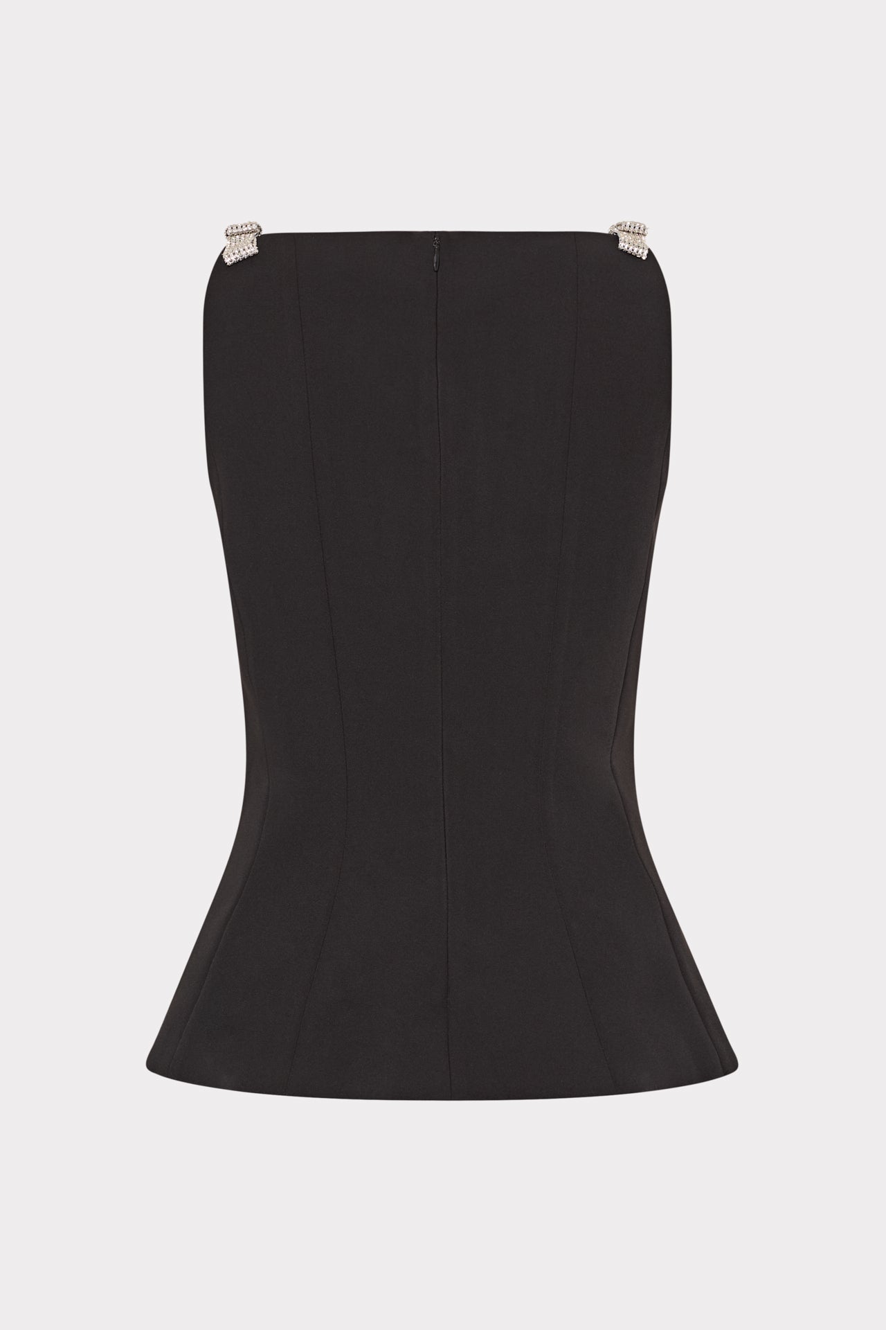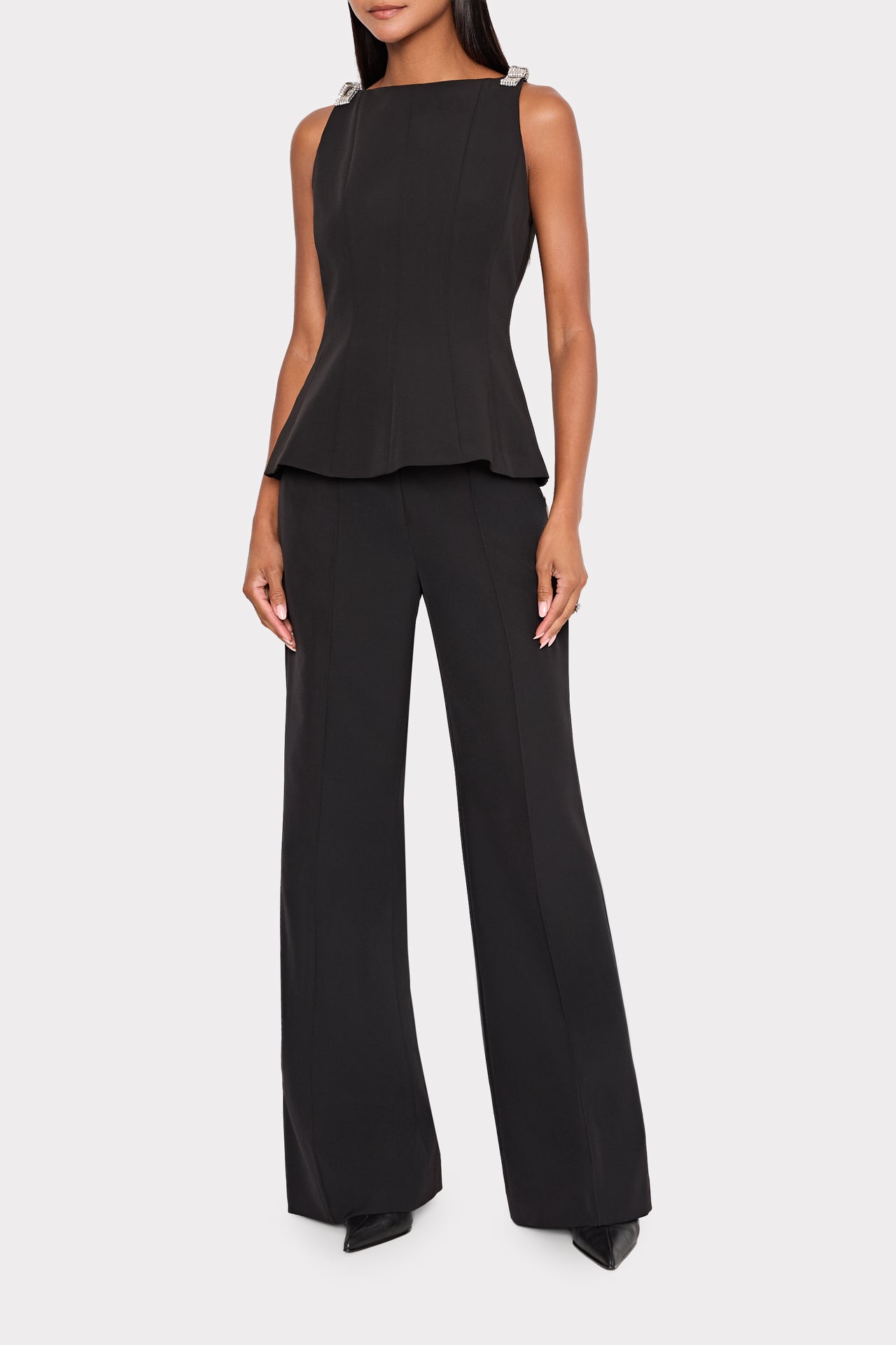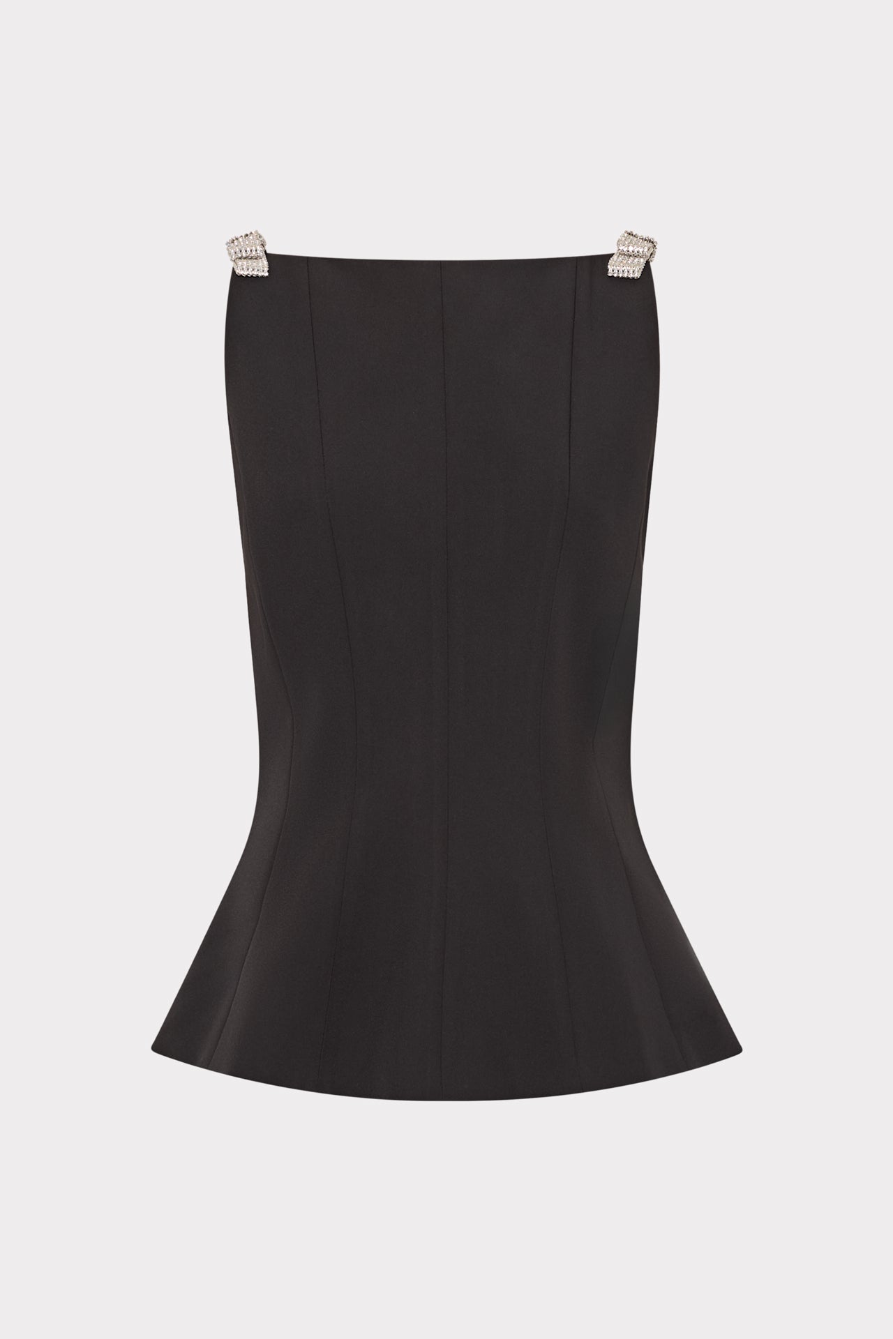 You can never have enough evening-ready tops for date night and the like. The Ruby top is accented with crystal bows at each shoulder and a peplum flare that hits past the waistline. Style it with your favorite pair of MILLY trousers or denim.