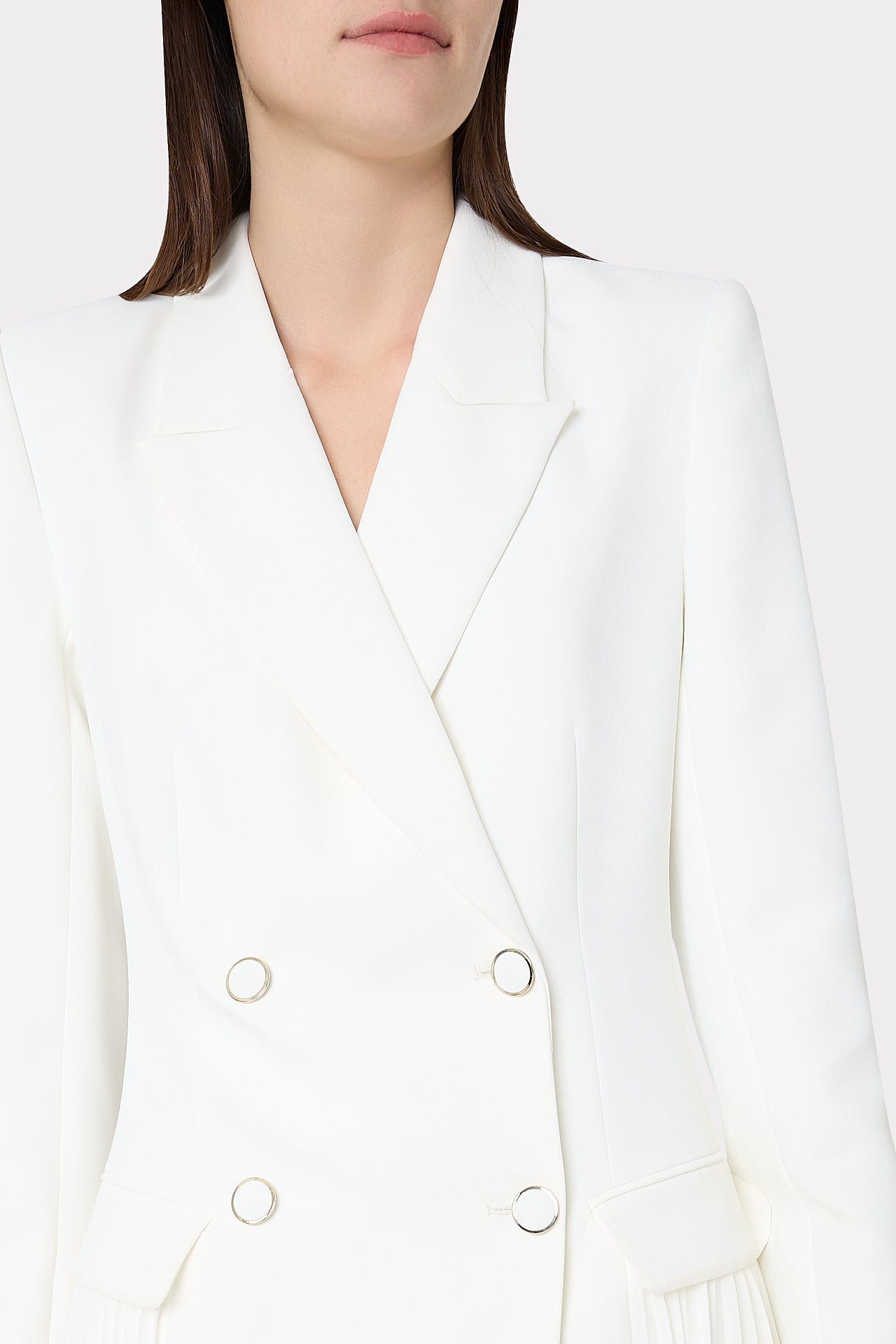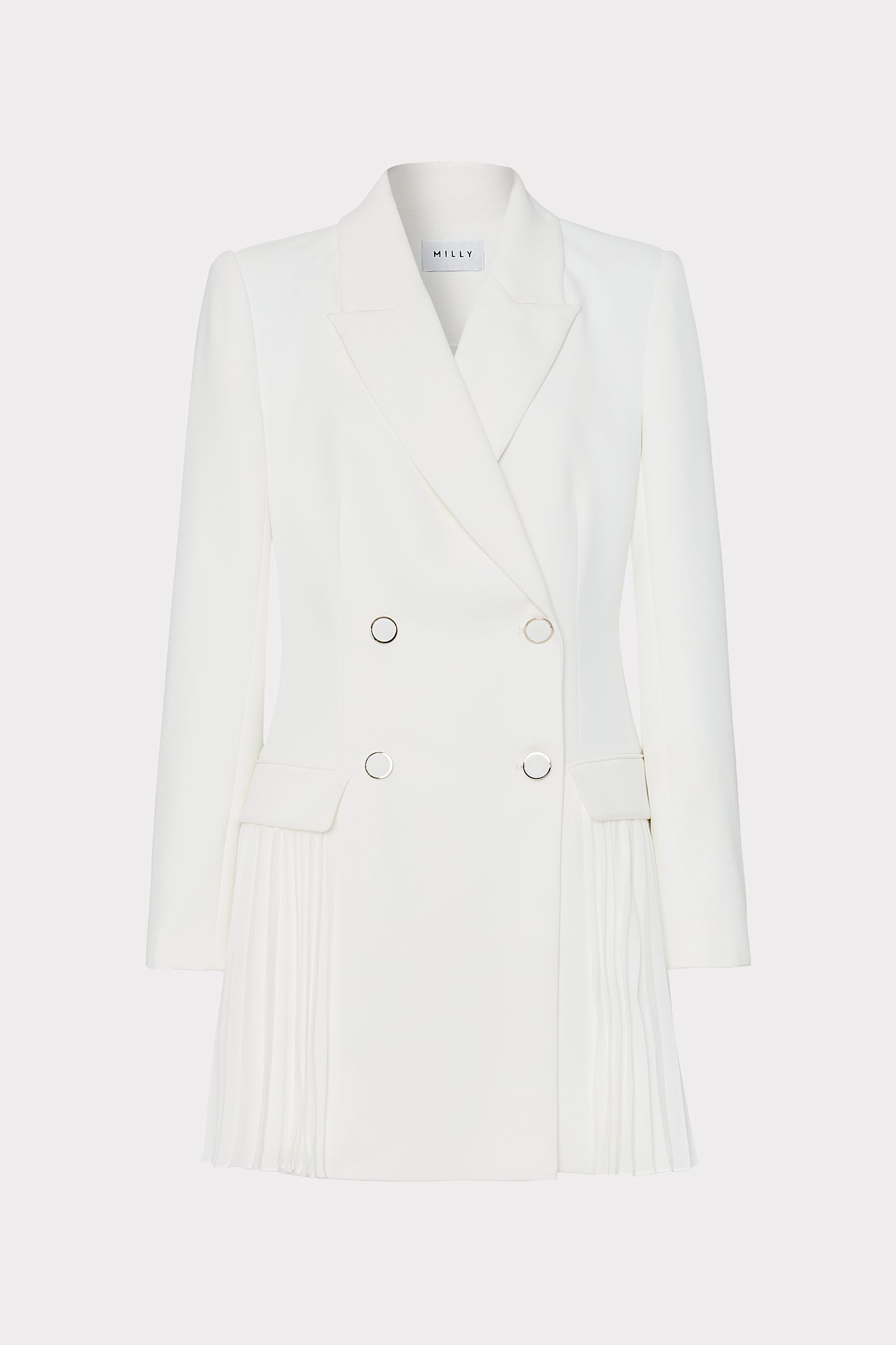 Perfect for every Fall occasion, the Noora is everything we love about a suiting look—minus the styling challenges. This bold and easy style is part blazer, part dress featuring shoulder pads, a front button closure along the placket, and a signature pleated skirt. It’s finished with pocket details at the hip and button details at the sleeve.