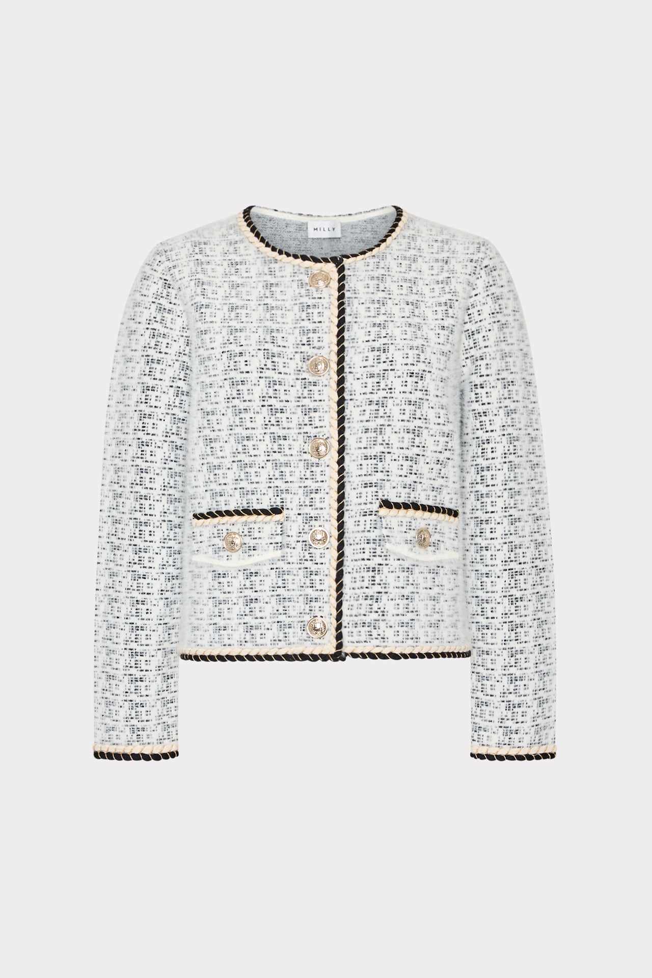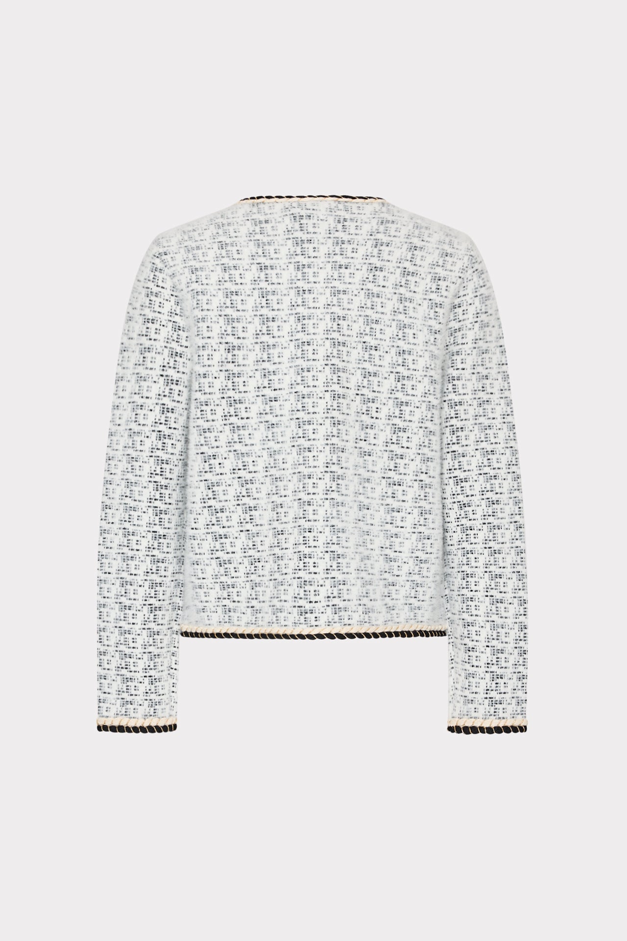 This cardigan jacket is cut from a knit material that's accented with a metallic, braided trim and non-functional pocket details for contrast. Wear it over its coordinating Braided V-Neck Knit Dress.