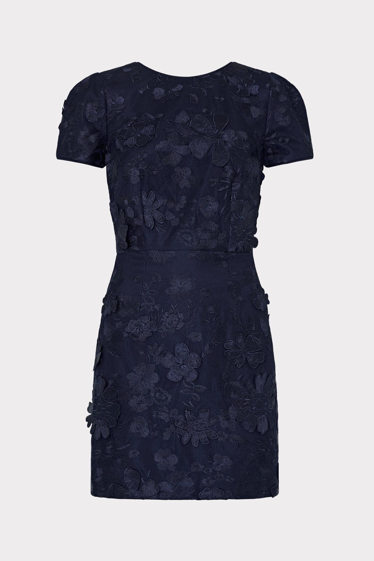 A modern classic, this short-sleeve mini features tonal floral embroidery and a flattering tailored fit. Effortlessly chic for dinners, parties, or any special night out.