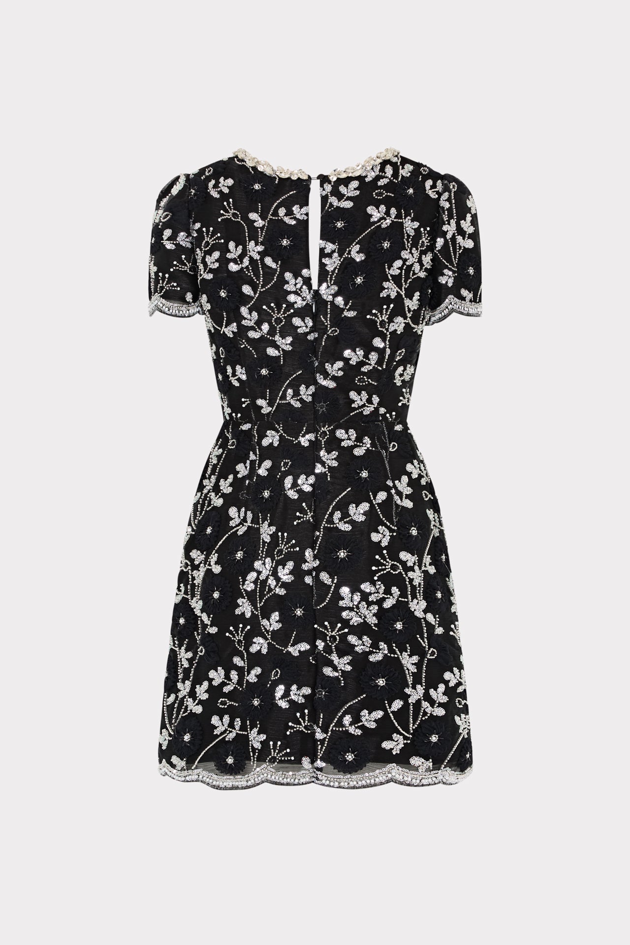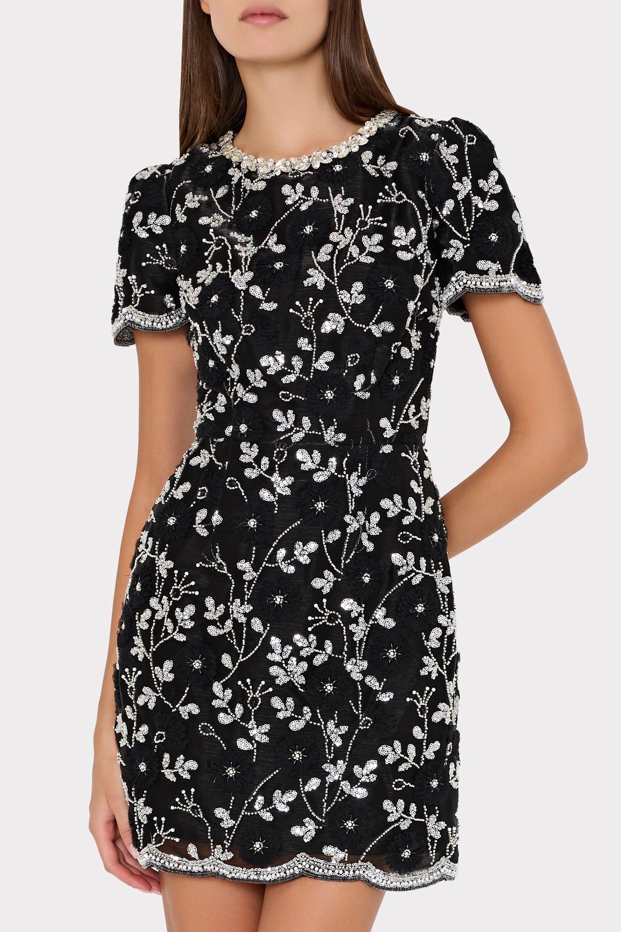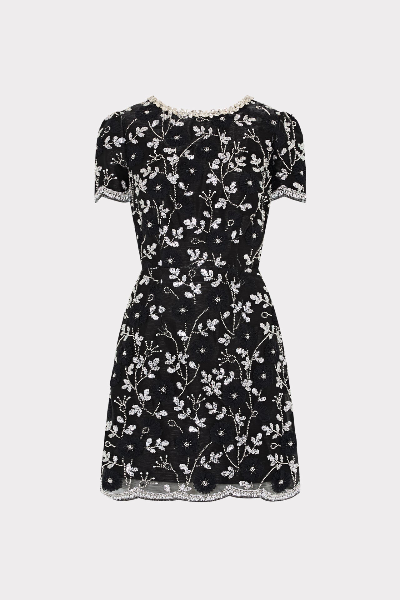 Turn heads in this embellished mini dress, featuring delicate floral beading and a sequin-trimmed neckline. A timeless statement piece that sparkles from every angle.