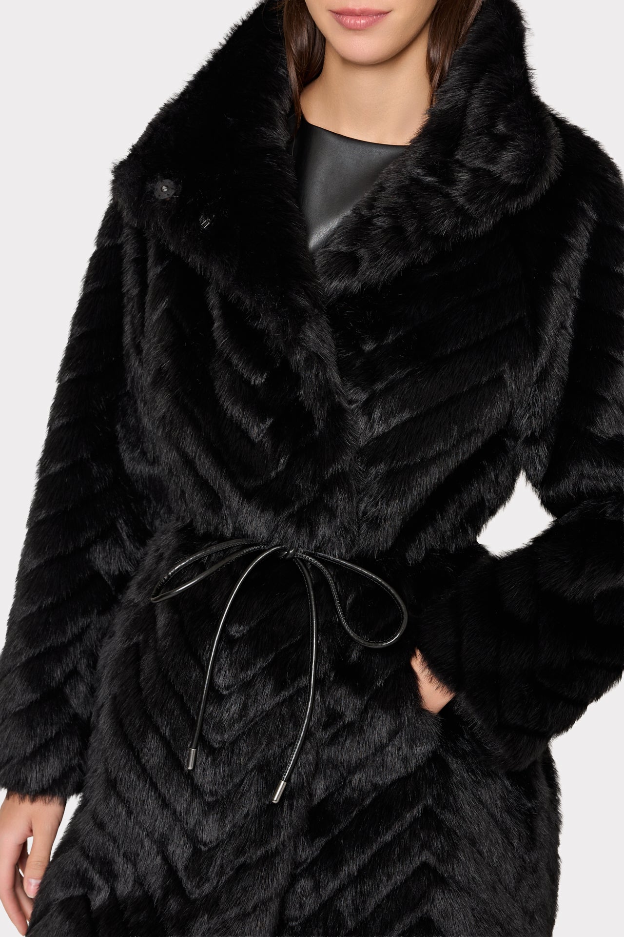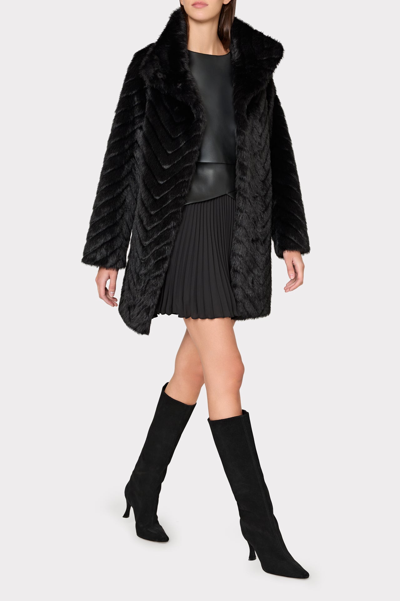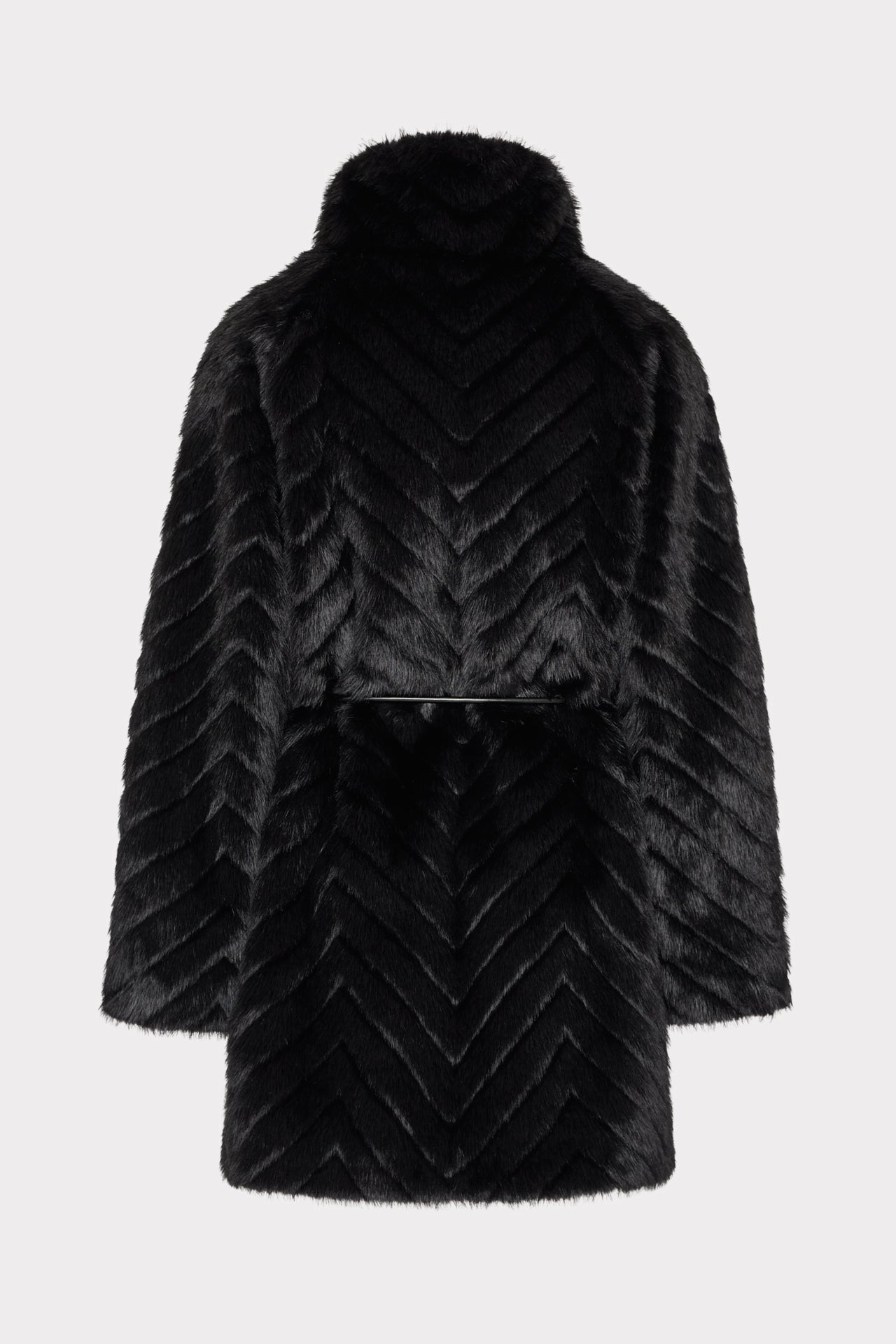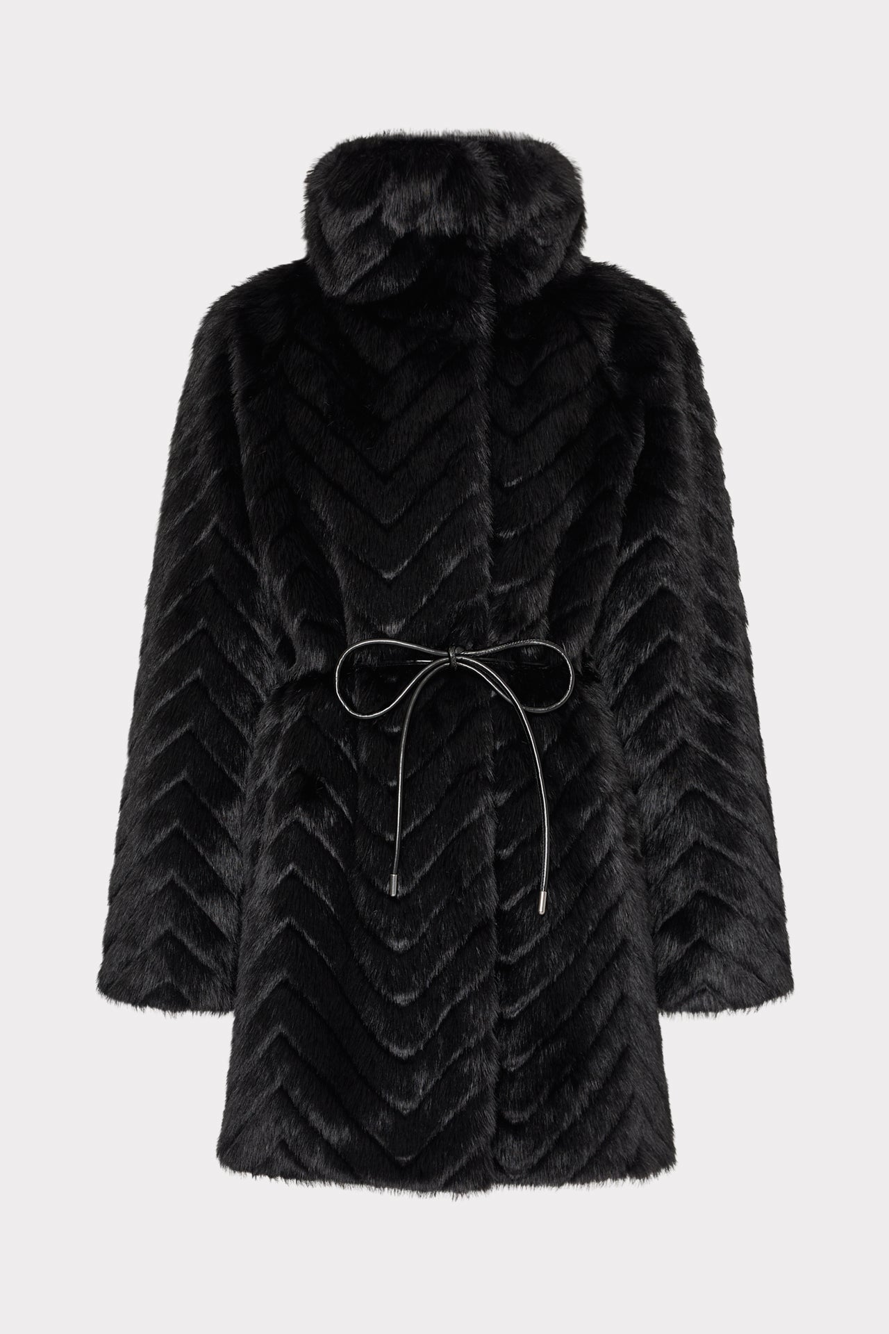Cut from luxuriously cozy faux fur, this mid-length coat is elevated by a wide set collar and a chevron design throughout. It’s accented with a faux leather belt and snaps to close. Wear it over your favorite MILLY looks all season long.