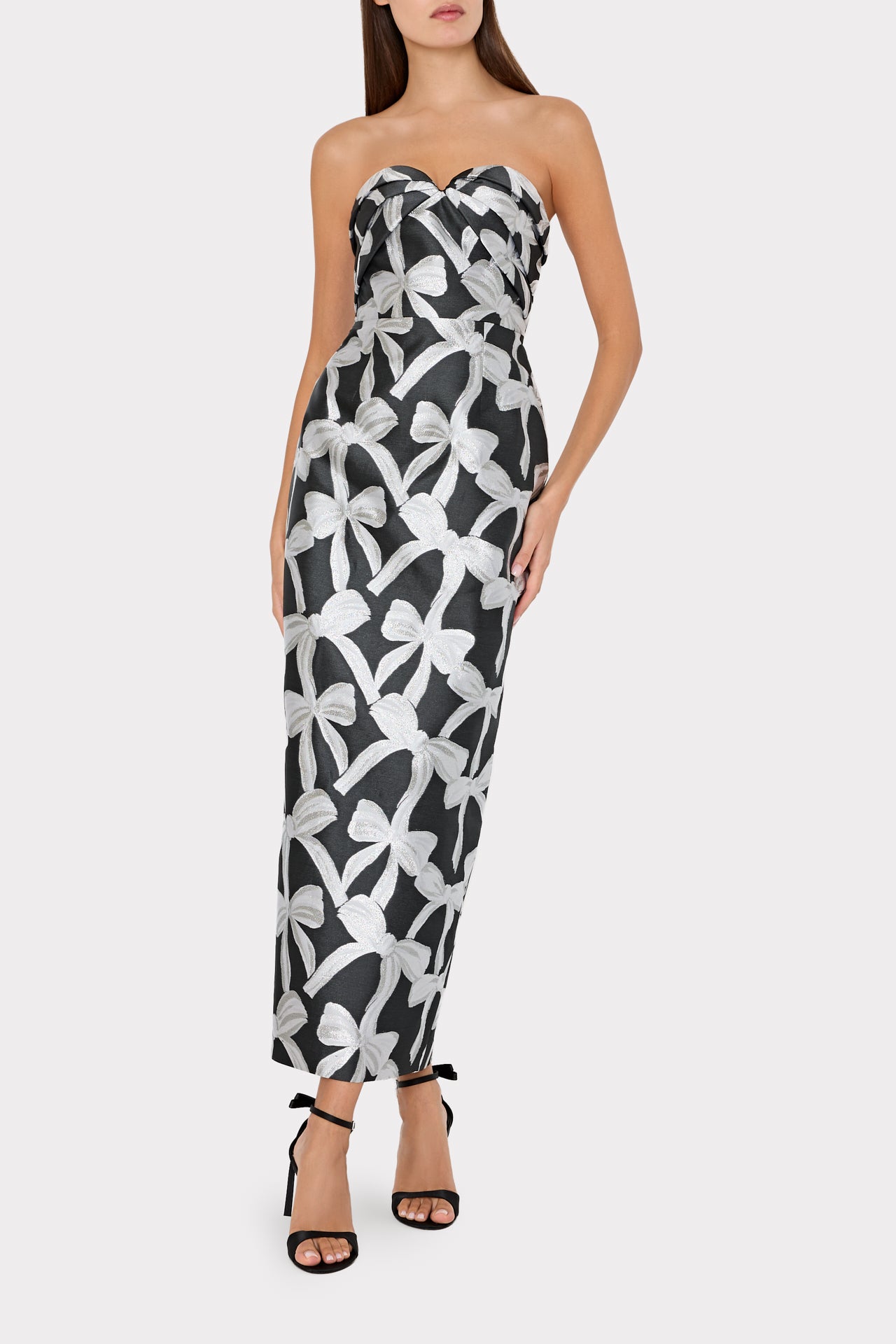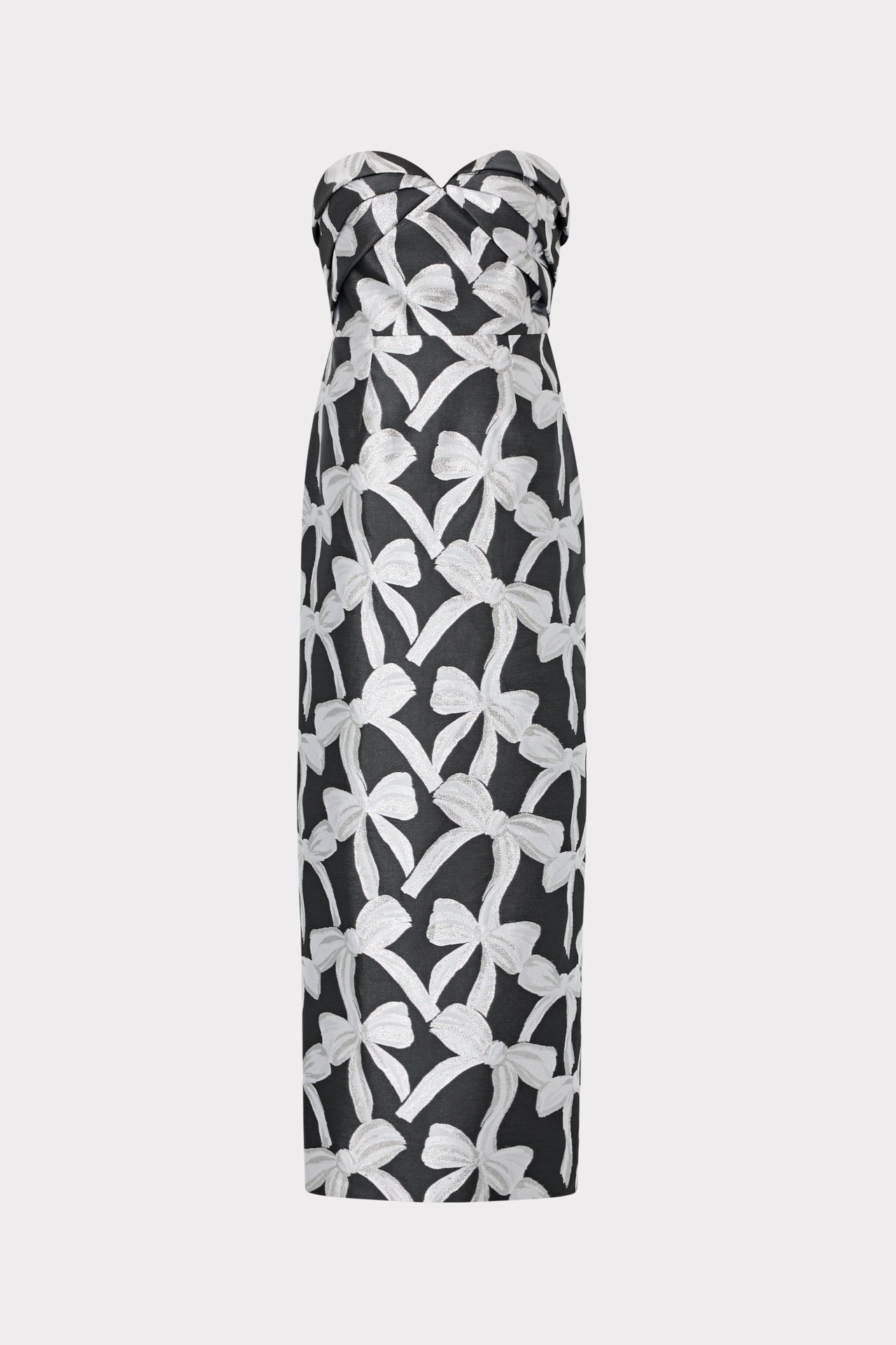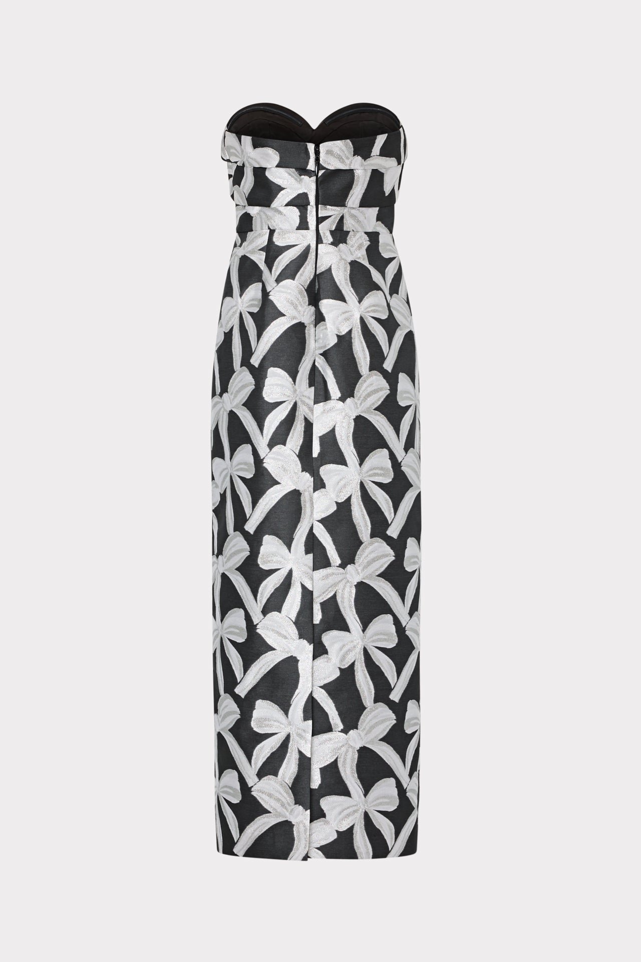 Striking and sophisticated, this strapless gown features an allover metallic bow motif and a sleek column silhouette. A statement piece made for black-tie moments and elegant soirées.