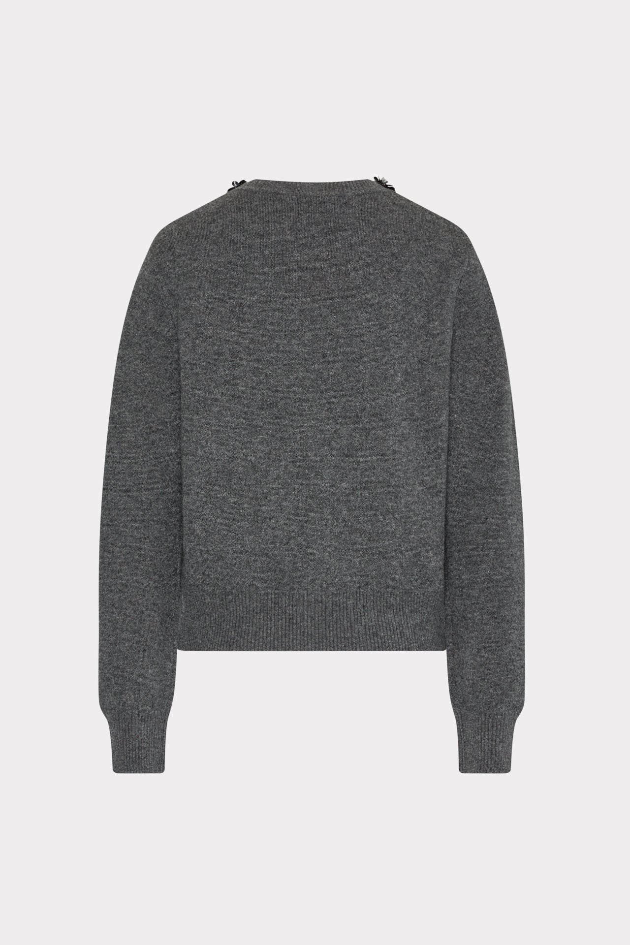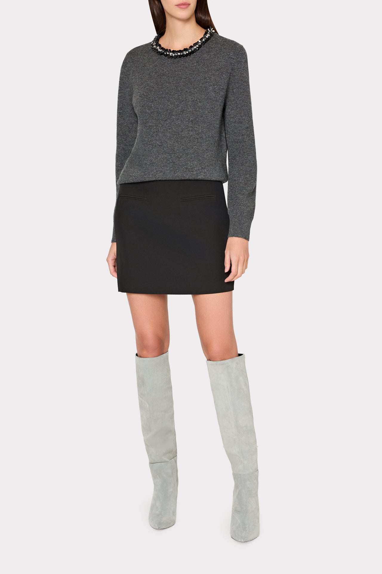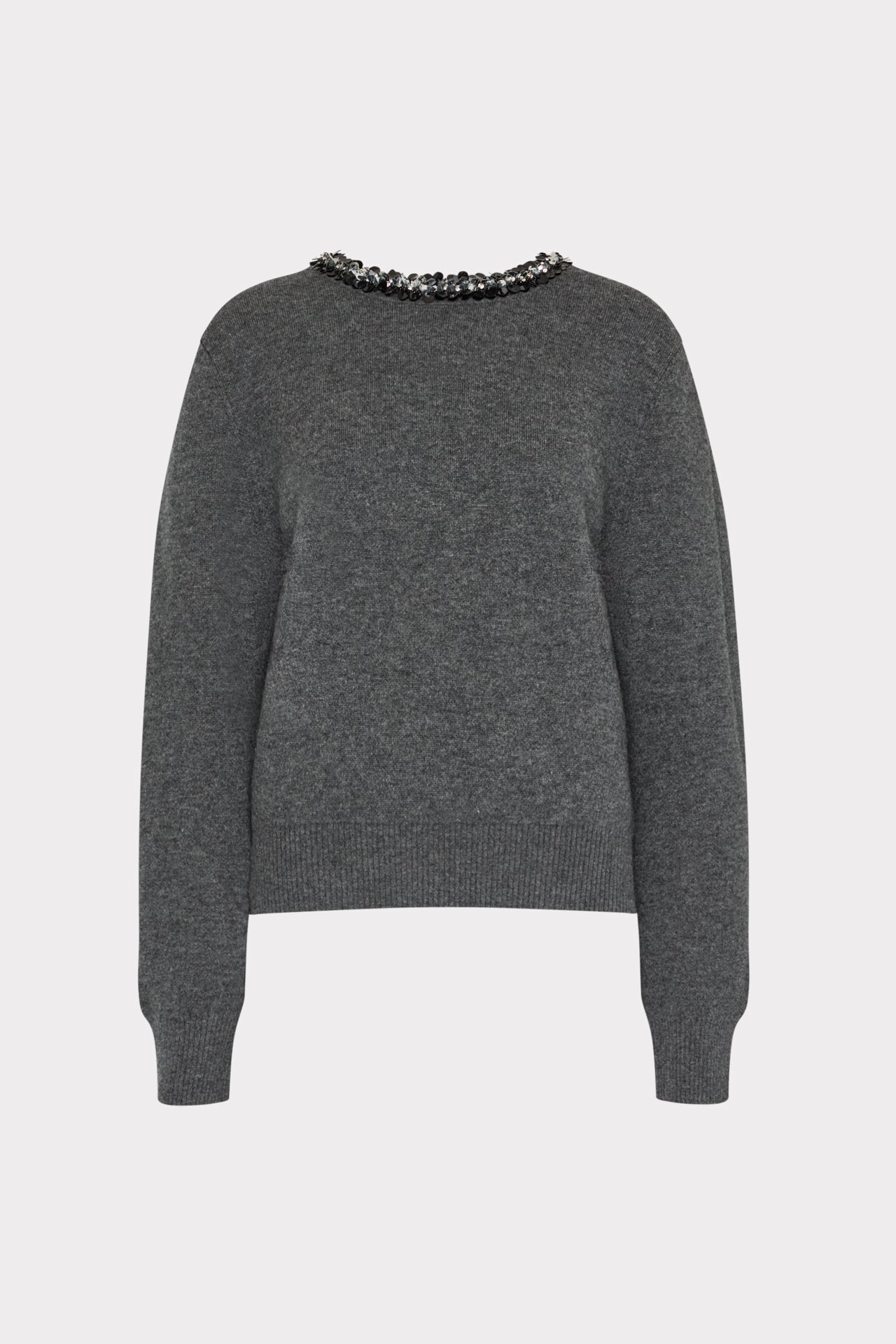 This cozy long-sleeved sweater is accented with a sparkly embellished neckline. Pair it with a sleek trouser for work, or dress it up with a MILLY mini skirt for a night out.