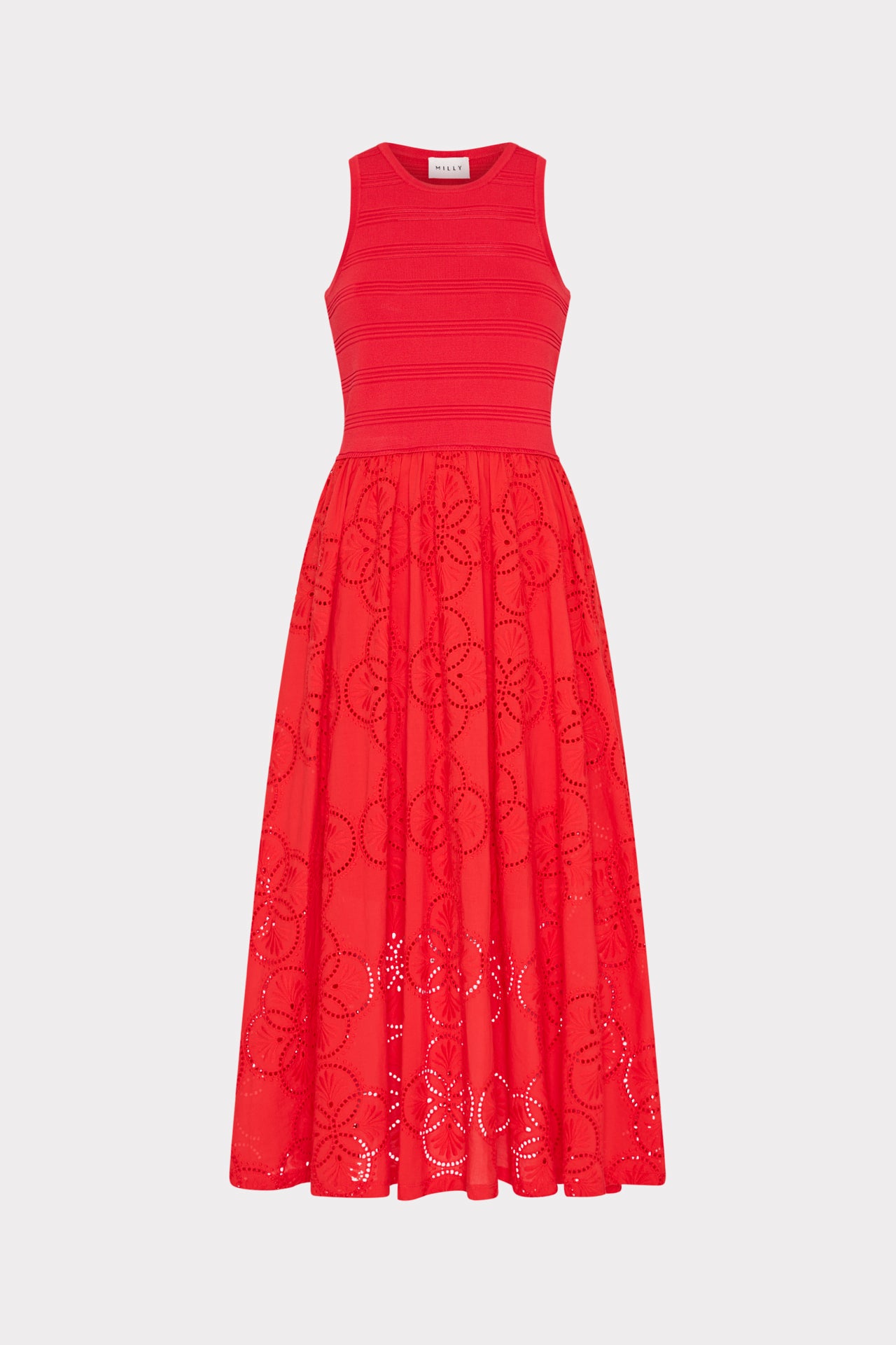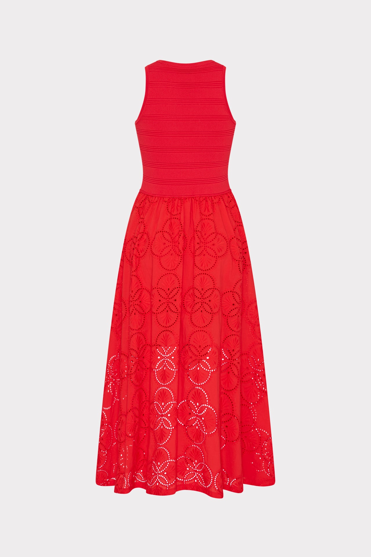 This ultra-flattering dress is made with a form fitting ribbed knit bodice and an attached cotton eyelet skirt that’s lined to the mid-thigh. Style yours with a neutral flat and wear it day or night, all season long.