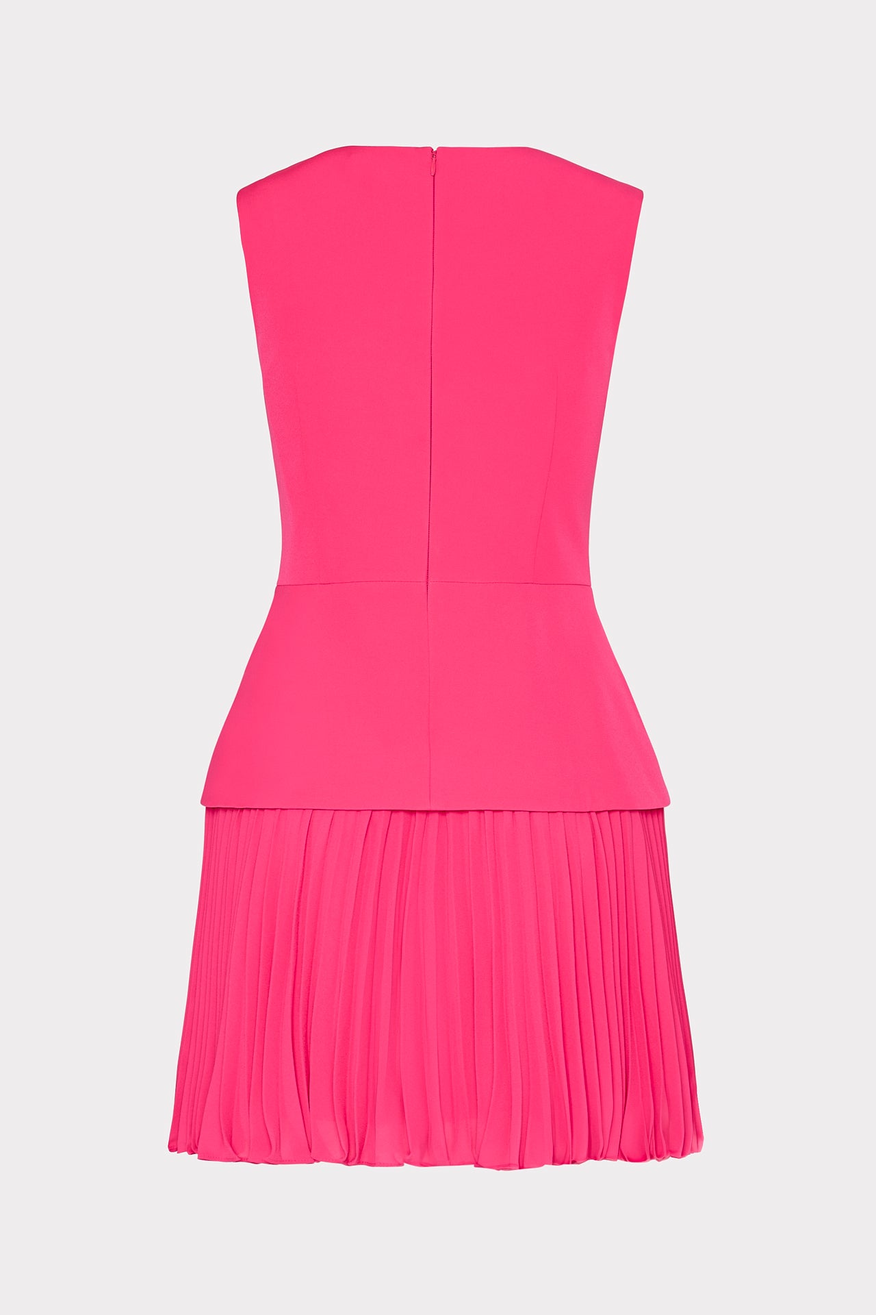 The Haddy Pleated Mini Dress is MILLY's signature women's desk-to-drinks dress, designed to move seamlessly from meetings to martinis without a wardrobe change. It features a mixed-media construction that combines a structured, form-fitting Cady bodice with a fluid, pleated chiffon mini skirt, creating a silhouette that is polished on top and effortlessly feminine below.
