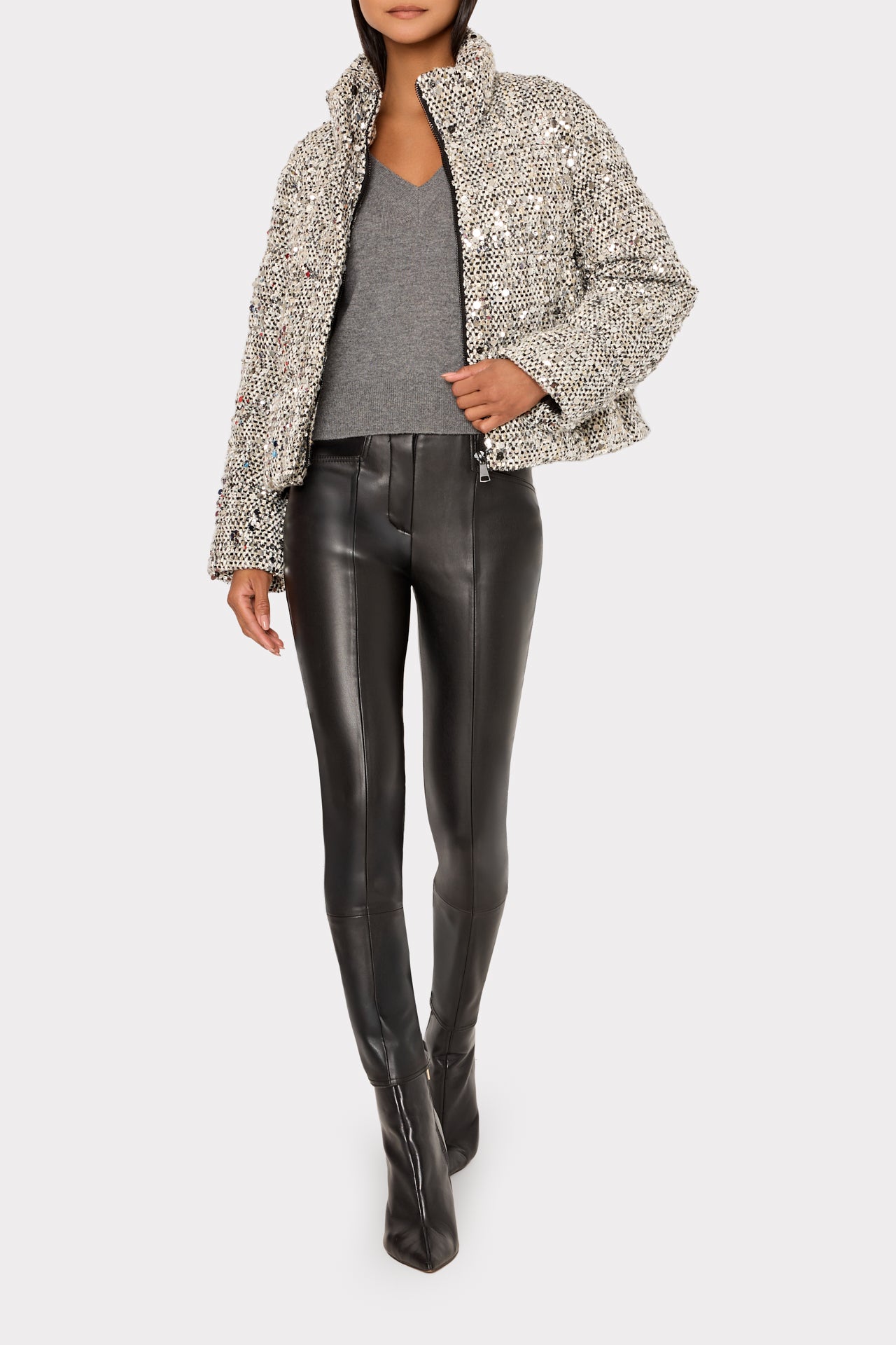 Morning coffee runs just got a lot more stylish. Transition into the colder weather with our hooded puffer jacket. This season, the Hayes puffer comes in an of-the-moment tweed with sequin detail woven throughout. Wear it with black denim and your favorite sneakers.