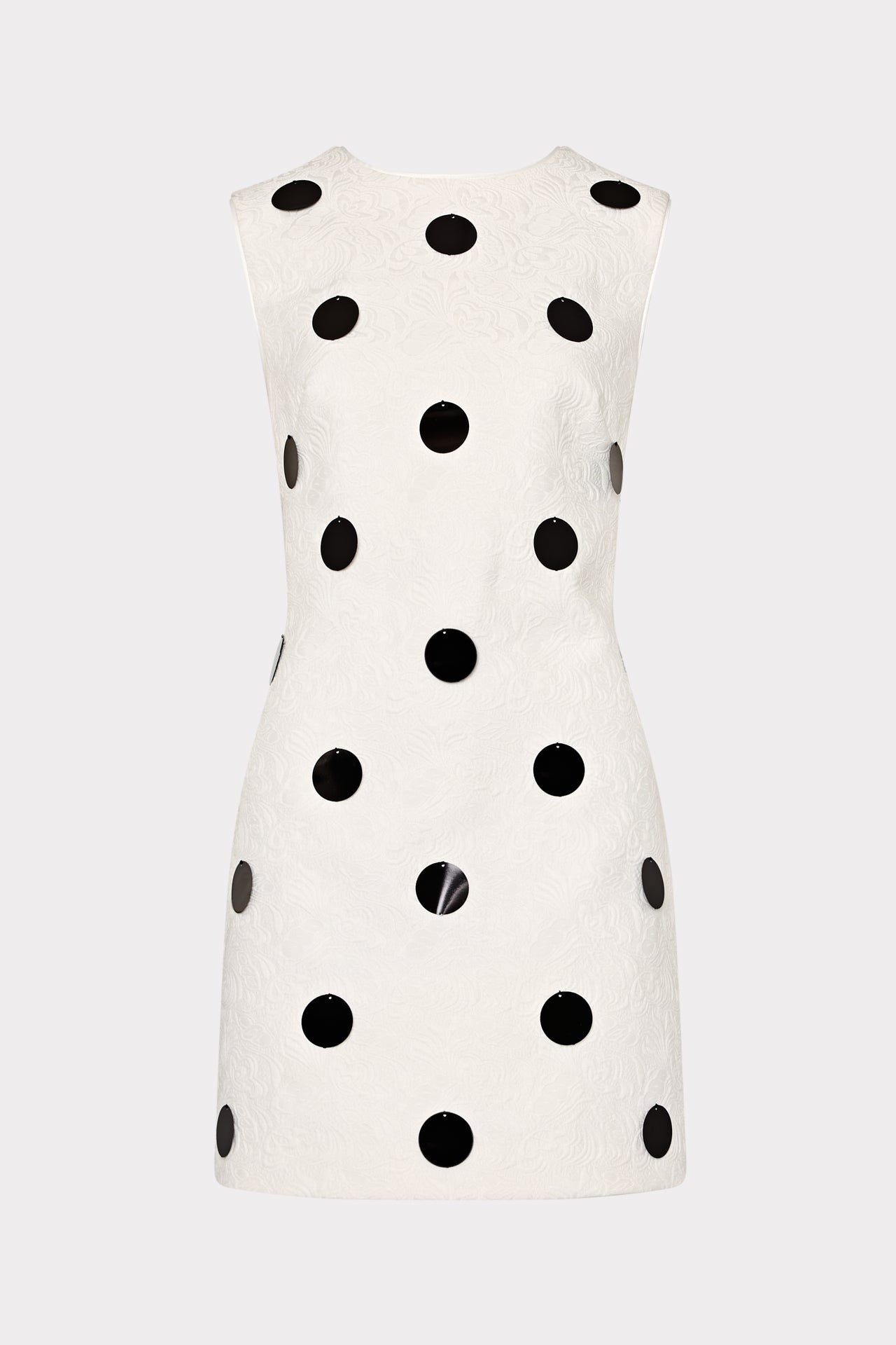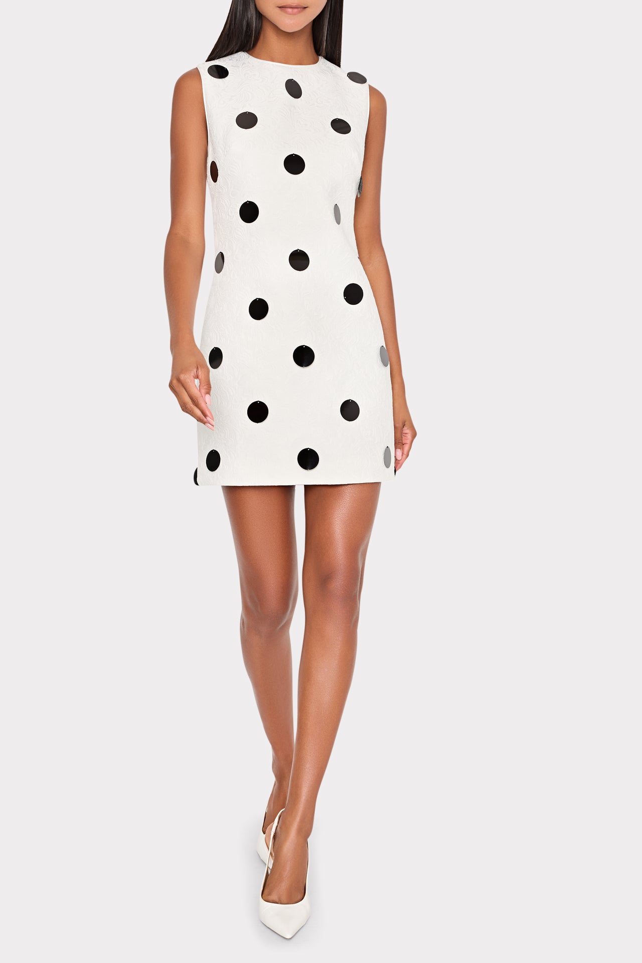 Ready for the holiday party season, this flattering mini shift-style dress is covered in party-ready paillette sequins throughout. It’s offered in white with black polka dots.