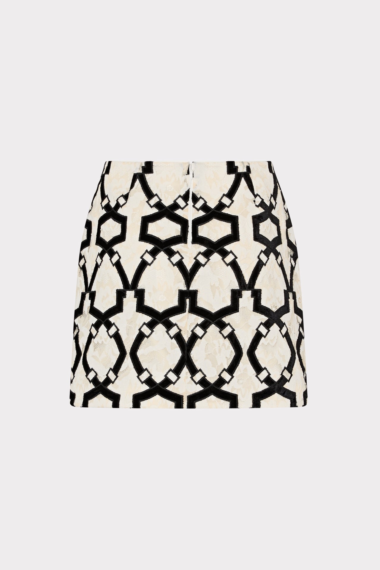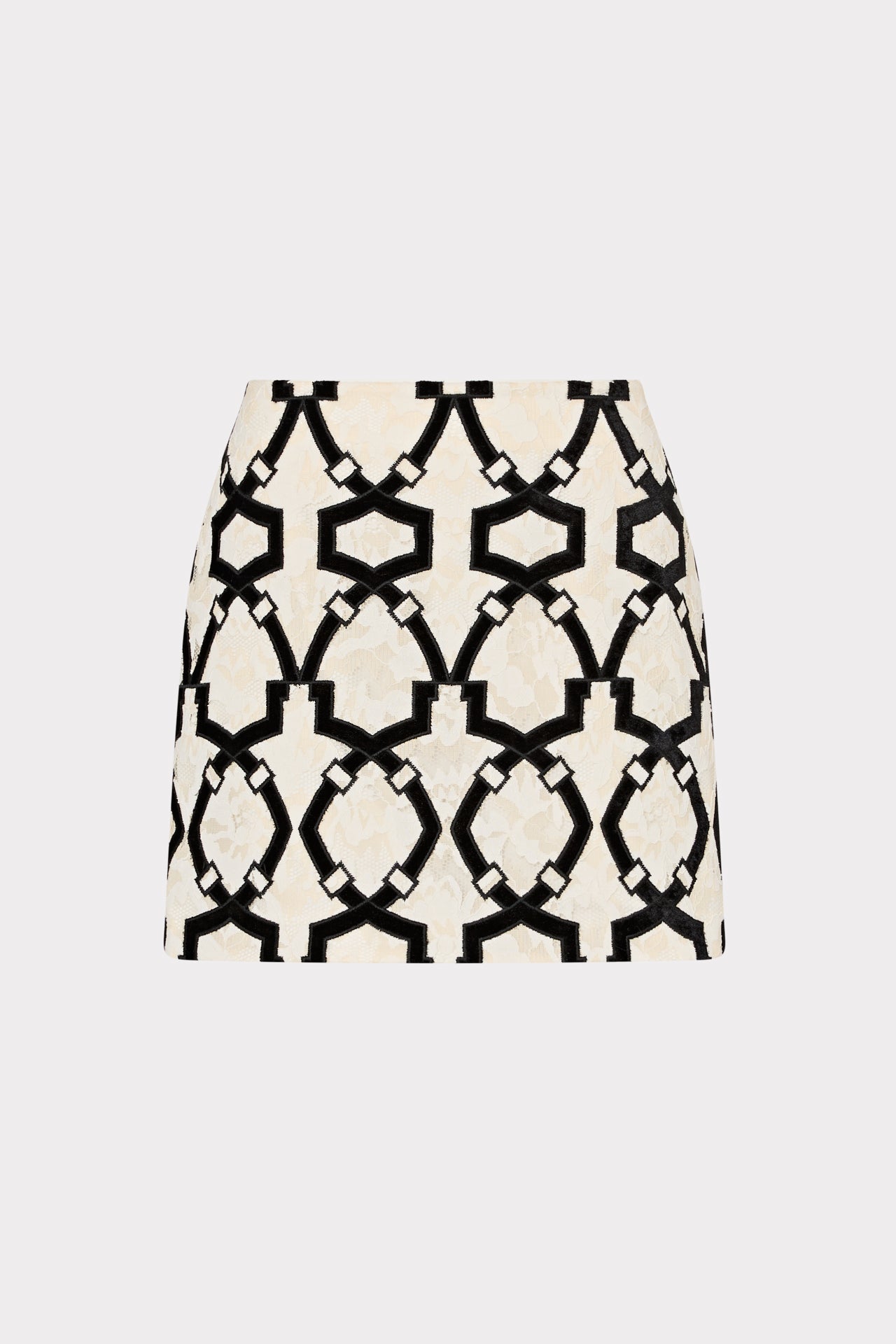 This statement mini skirt features a bold, black velvet geometric print over delicate white lace for a striking contrast. For the full look, style it with our new Bow Sweater.