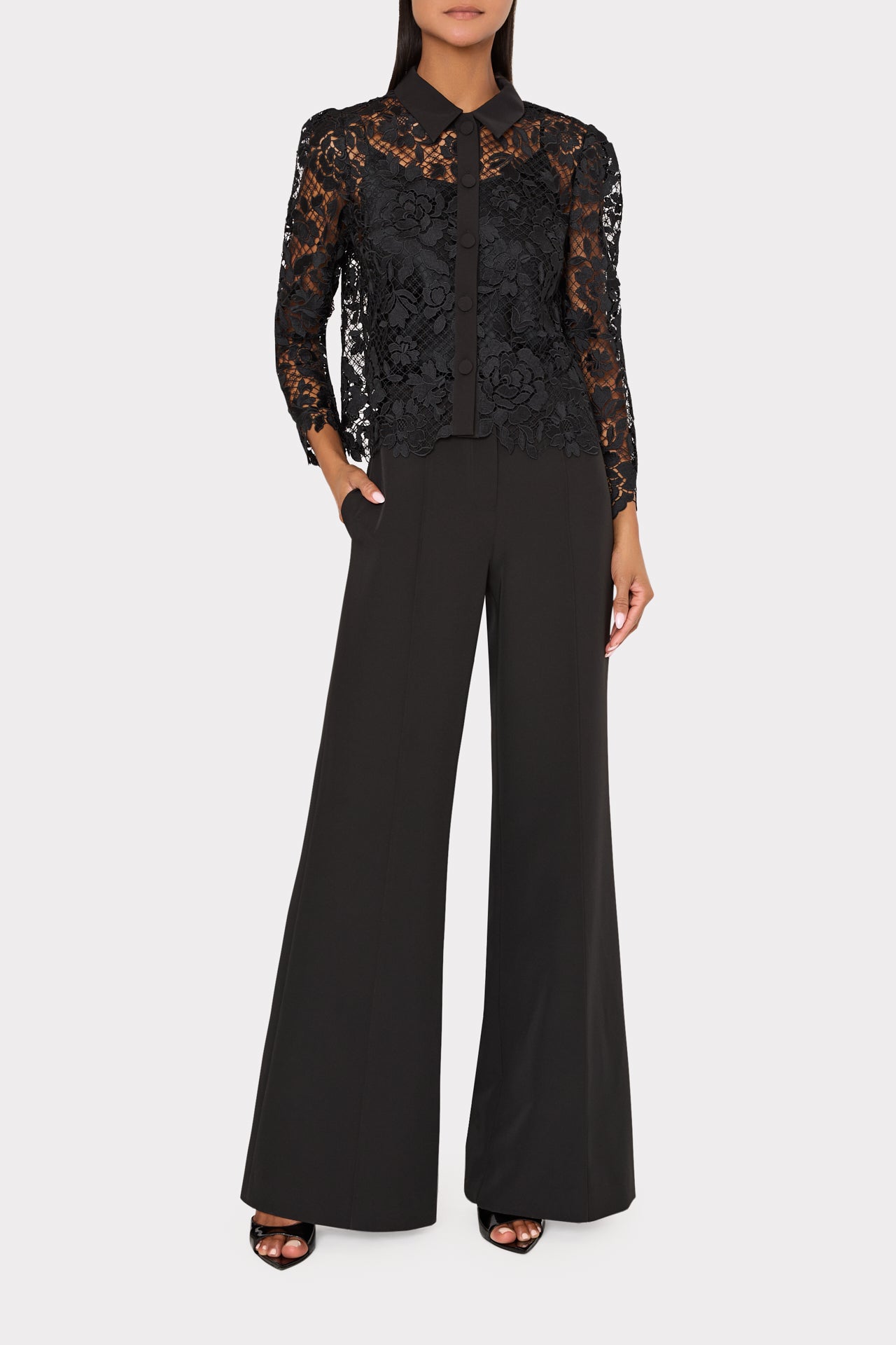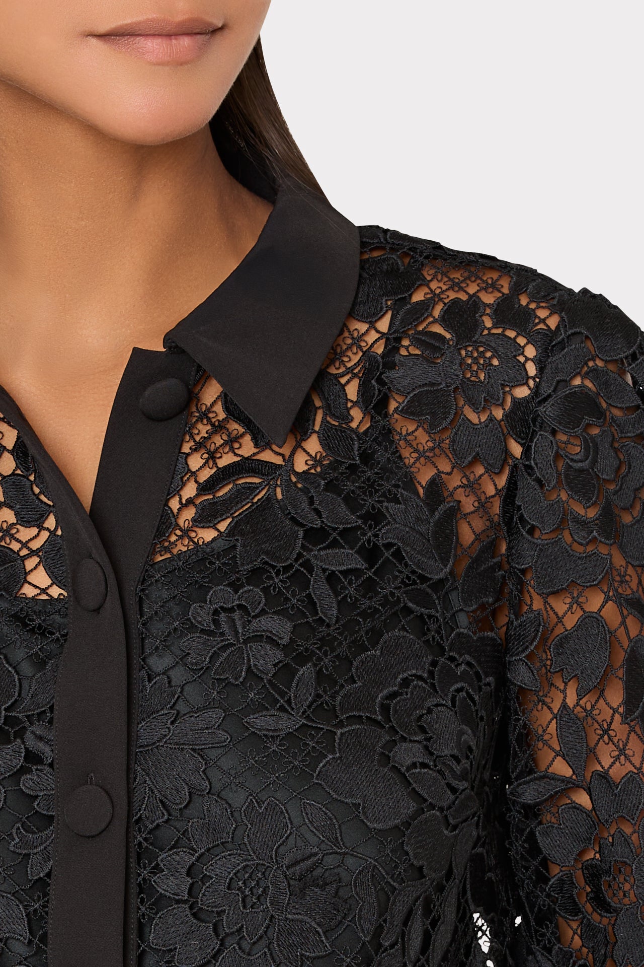 Introducing an all-new silhouette in our best-selling lace, an embroidered rose floral fabric with a soft and sheer design. The sleek and straight shape is now paired with a slim, 3/4 length sleeve, with a hidden zipper at the wrist for room if you choose. Its pleated shoulder creates a subtle puffy sleeve, adding a feminine touch to the classic button-up and collar details. Wear it over a lacy bra or a silk cami.