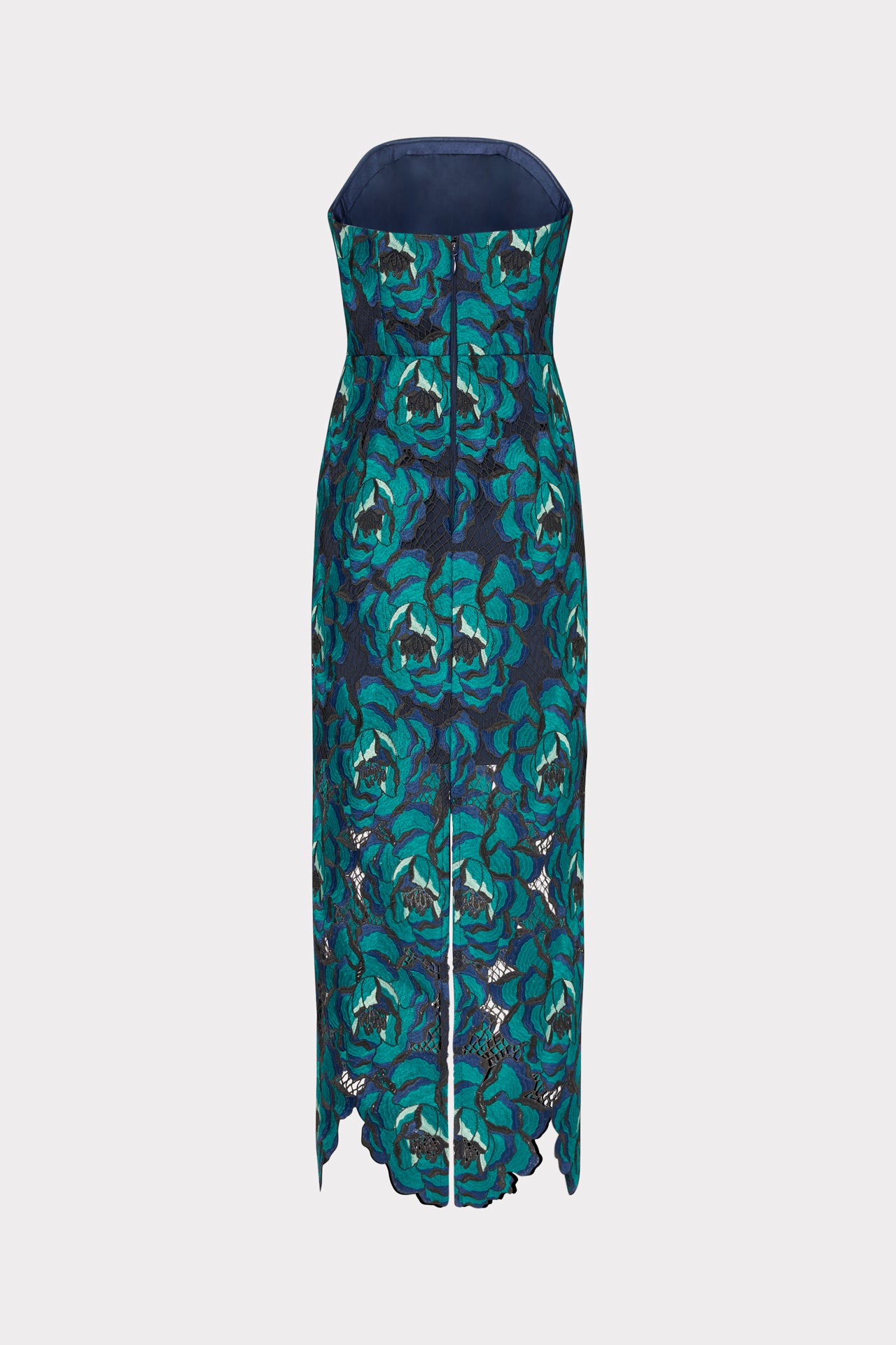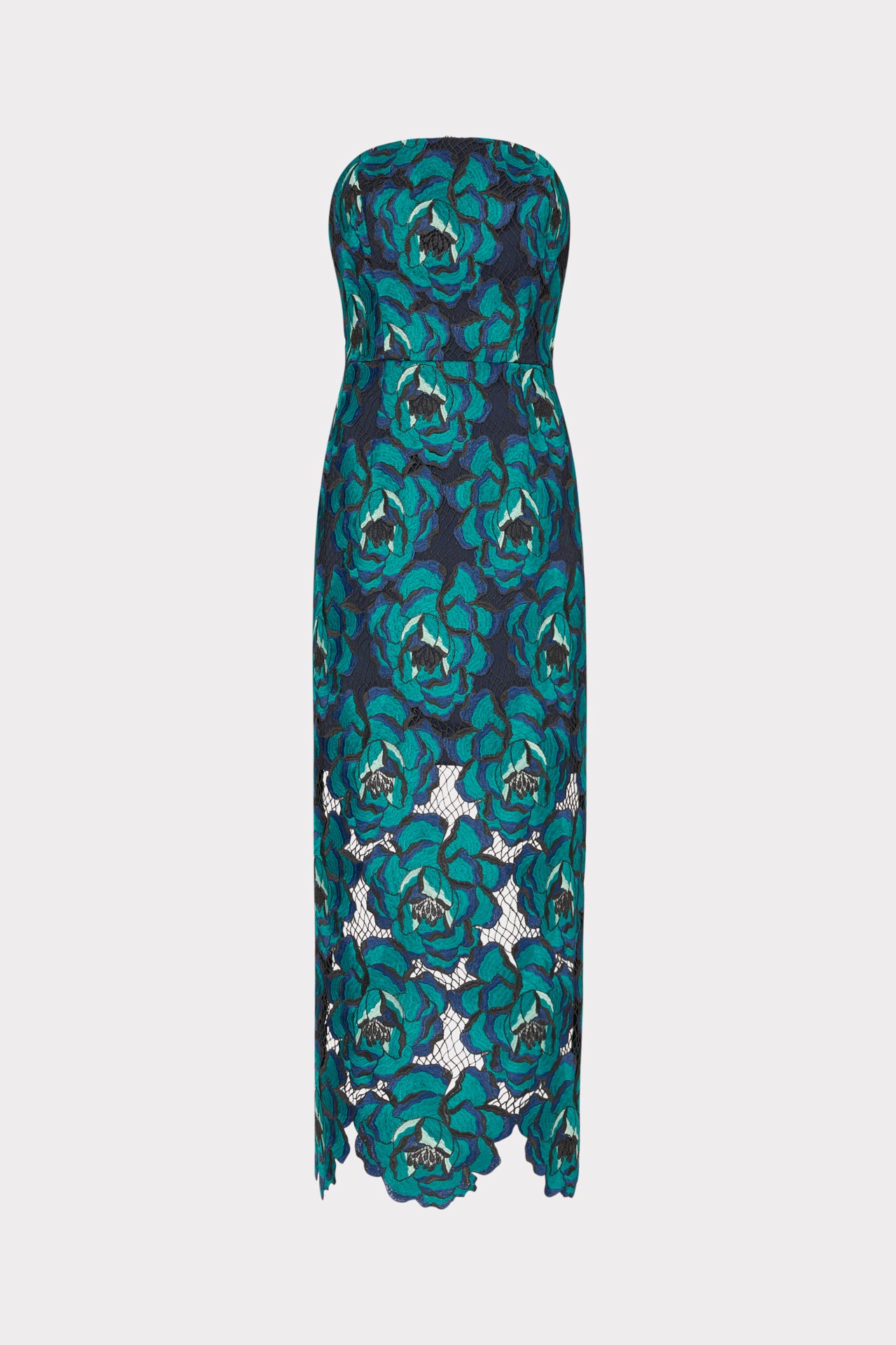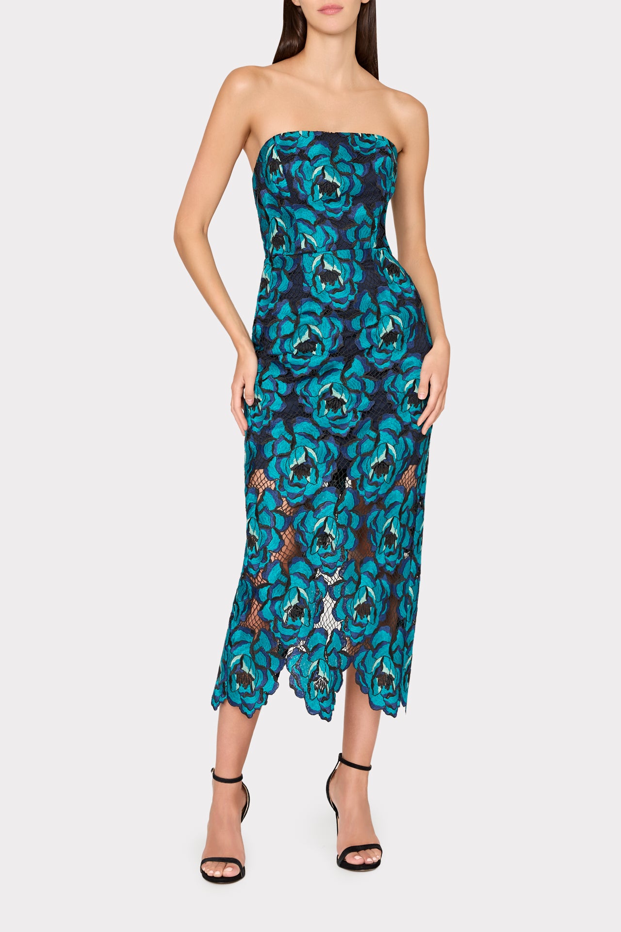 Introducing the Kait Blue Blossom Dress, a chic, straight ankle-length dress that’s perfect for your next special event. This strapless dress features intricate floral embroidery with boning in the bodice for structure, elastic support band, and a back zipper to close. It’s so stunning without sacrificing the comfort you need to radiate all evening long.