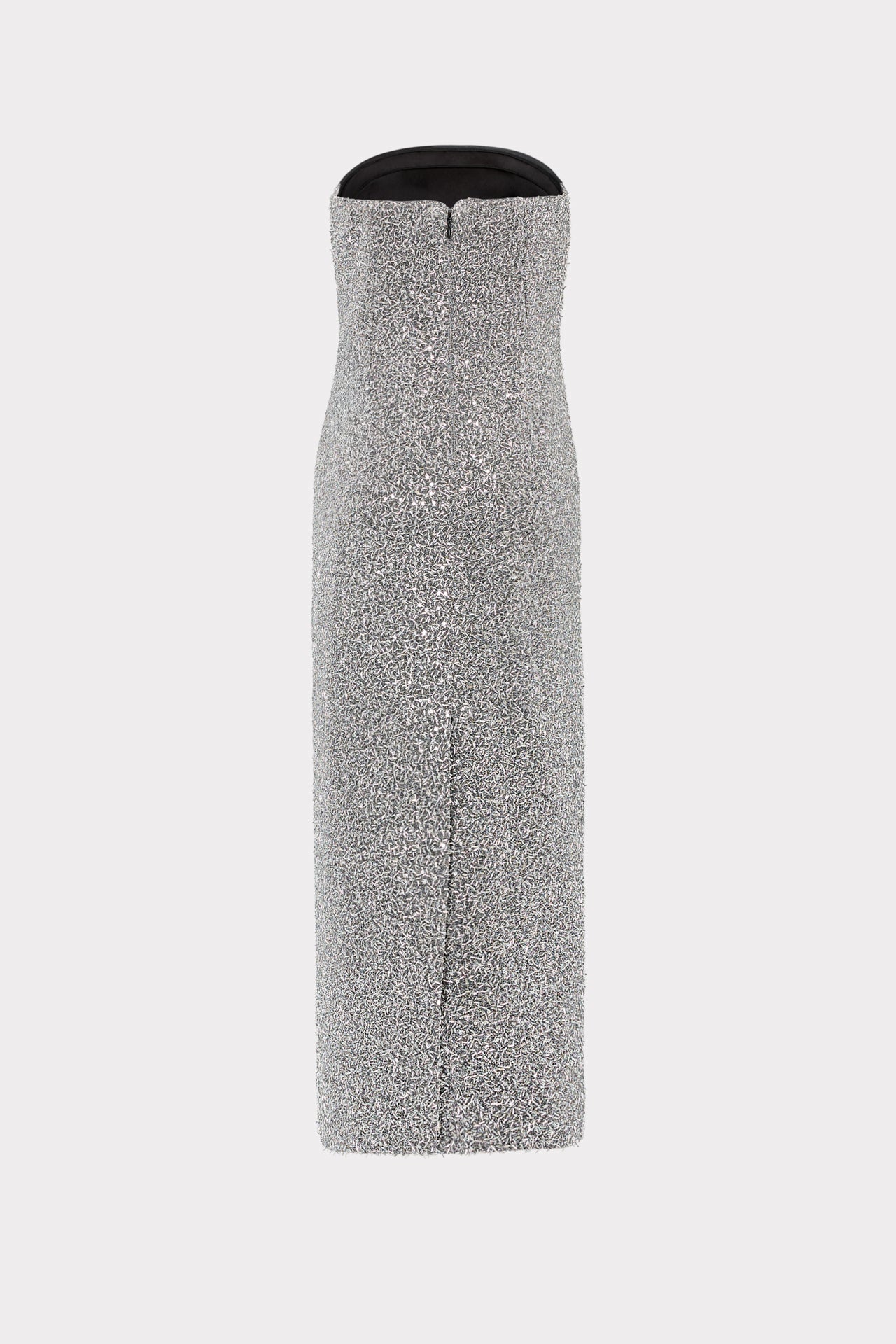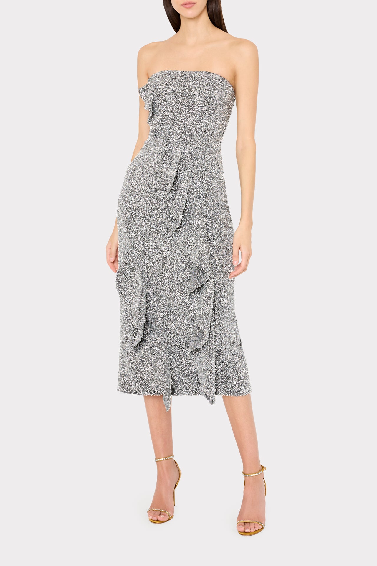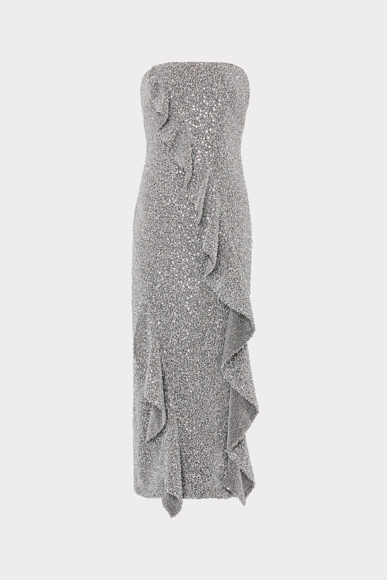 This sophisticated party dress is a stunning choice for all your upcoming celebrations. It’s covered in small silver sequins and bugle beads atop a luxe metallic base that’s fitted to your hourglass shape with a boned-in bodice and flattering strapless neckline. Two cascading ruffles add drama with every step, finished with a back slit and zipper for ease.