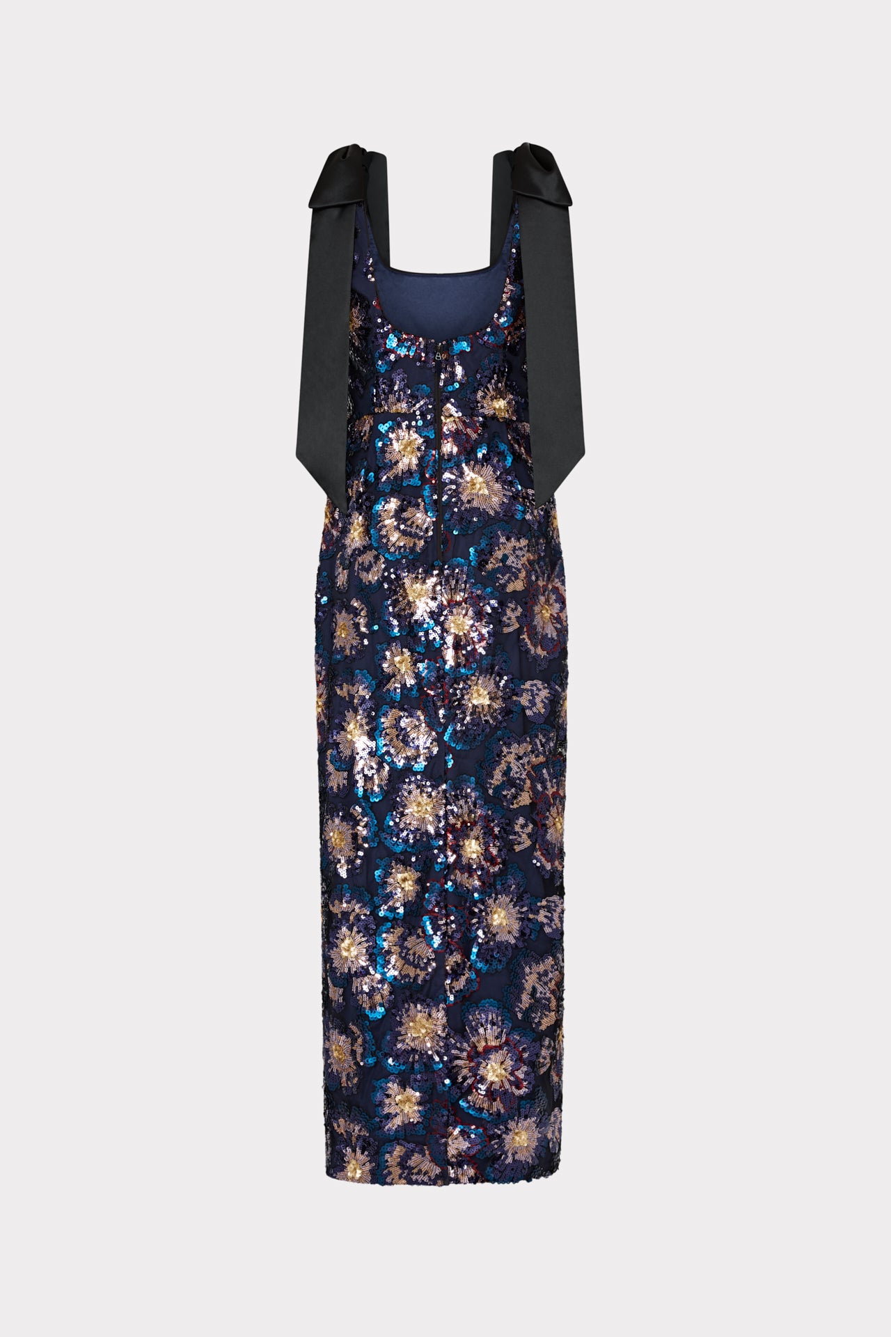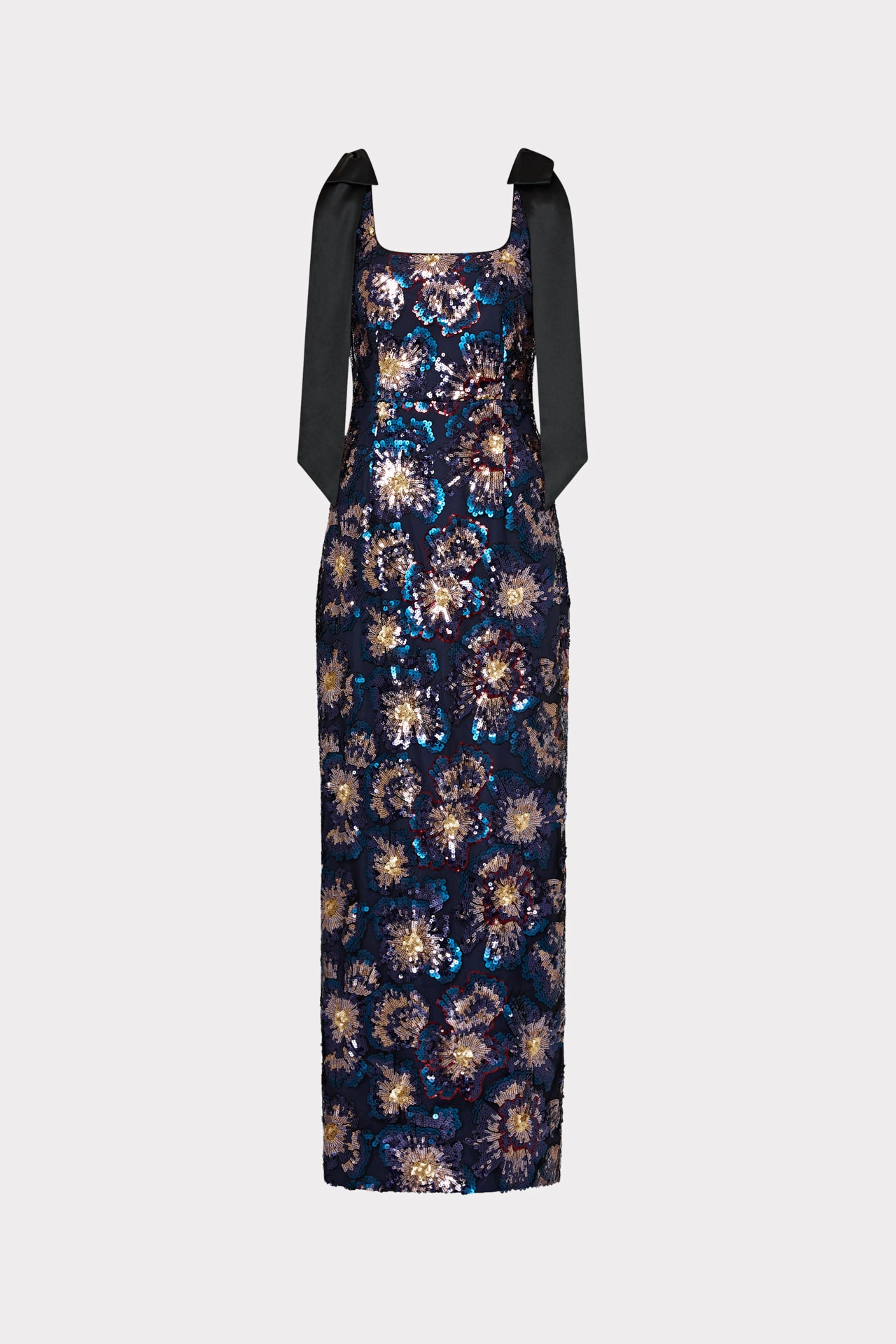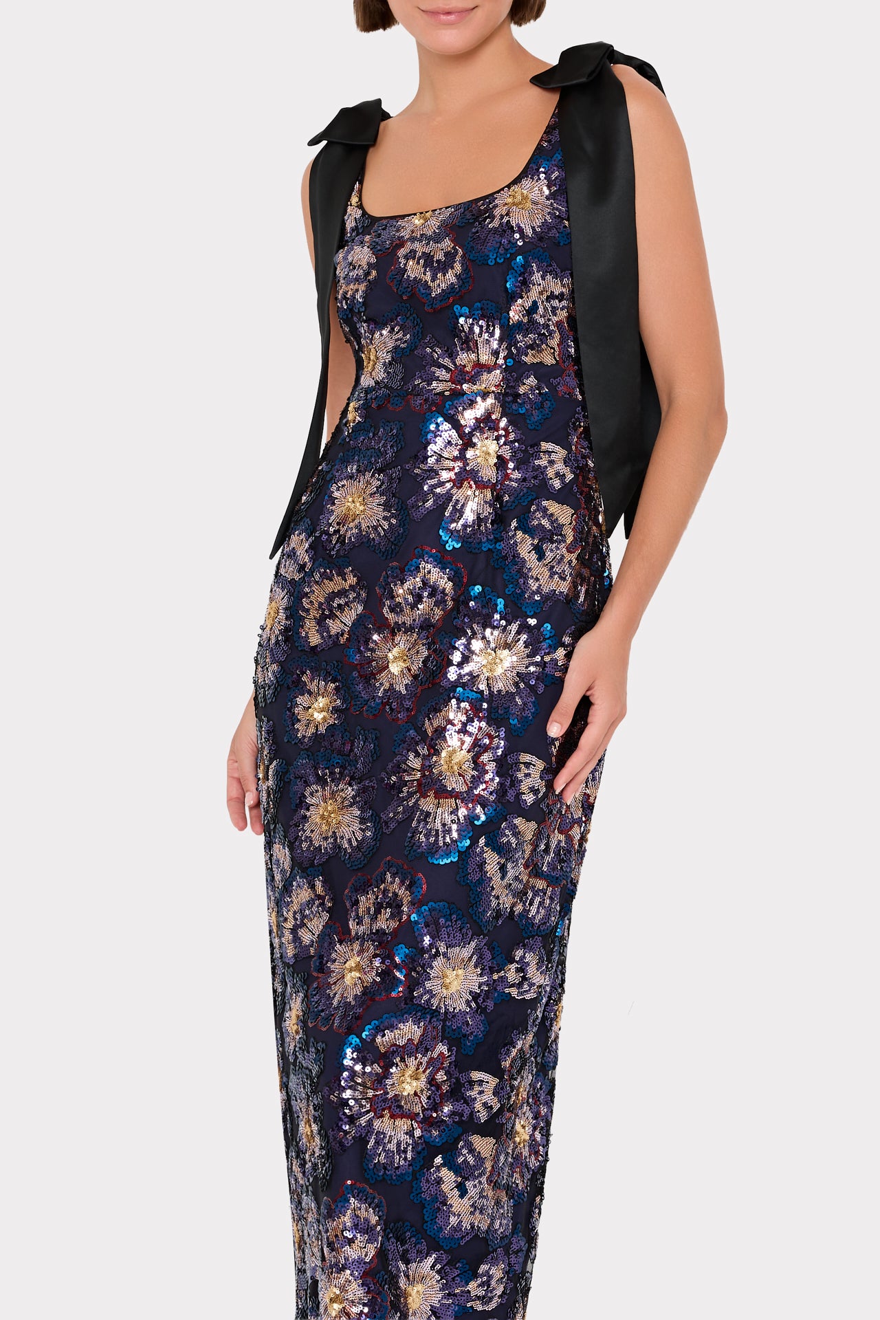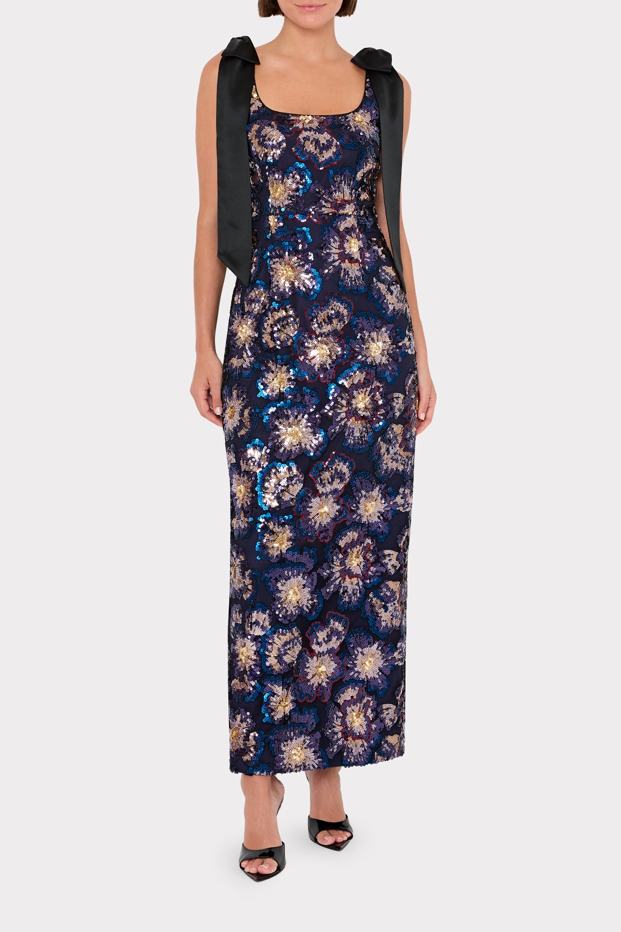 This column dress is adorned with shimmering floral sequins for a show-stopping effect. Finished with satin bow straps, it’s the perfect statement piece for black-tie events, galas, or holiday soirées.
