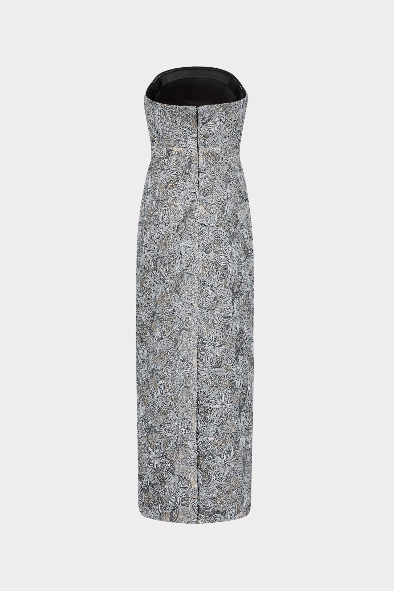 Elevated elegance meets modern femininity. This strapless column dress is crafted with intricate floral embroidery that shimmers with subtle texture and dimension. The fitted bodice highlights the waist, while the straight silhouette elongates the figure for a sleek, timeless look. Designed for weddings, evening events, and special occasions, it’s a statement piece that blends artistry with effortless sophistication.