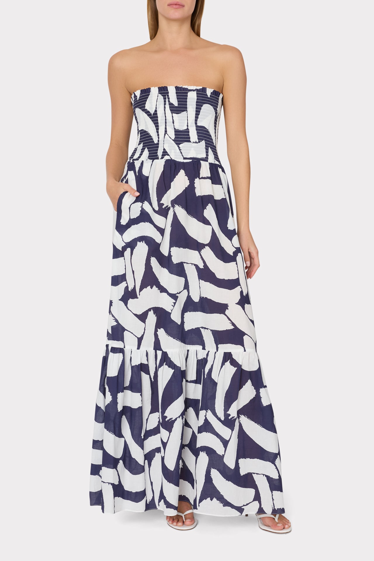 Perfect for your next beach holiday, the Olen maxi features our new, eye-catching navy and ecru Graphic Brushstroke print. Cut from cotton poplin, it has a strapless neckline with smocking throughout the bodice. Style yours with MILLY swimwear and neutral accessories.