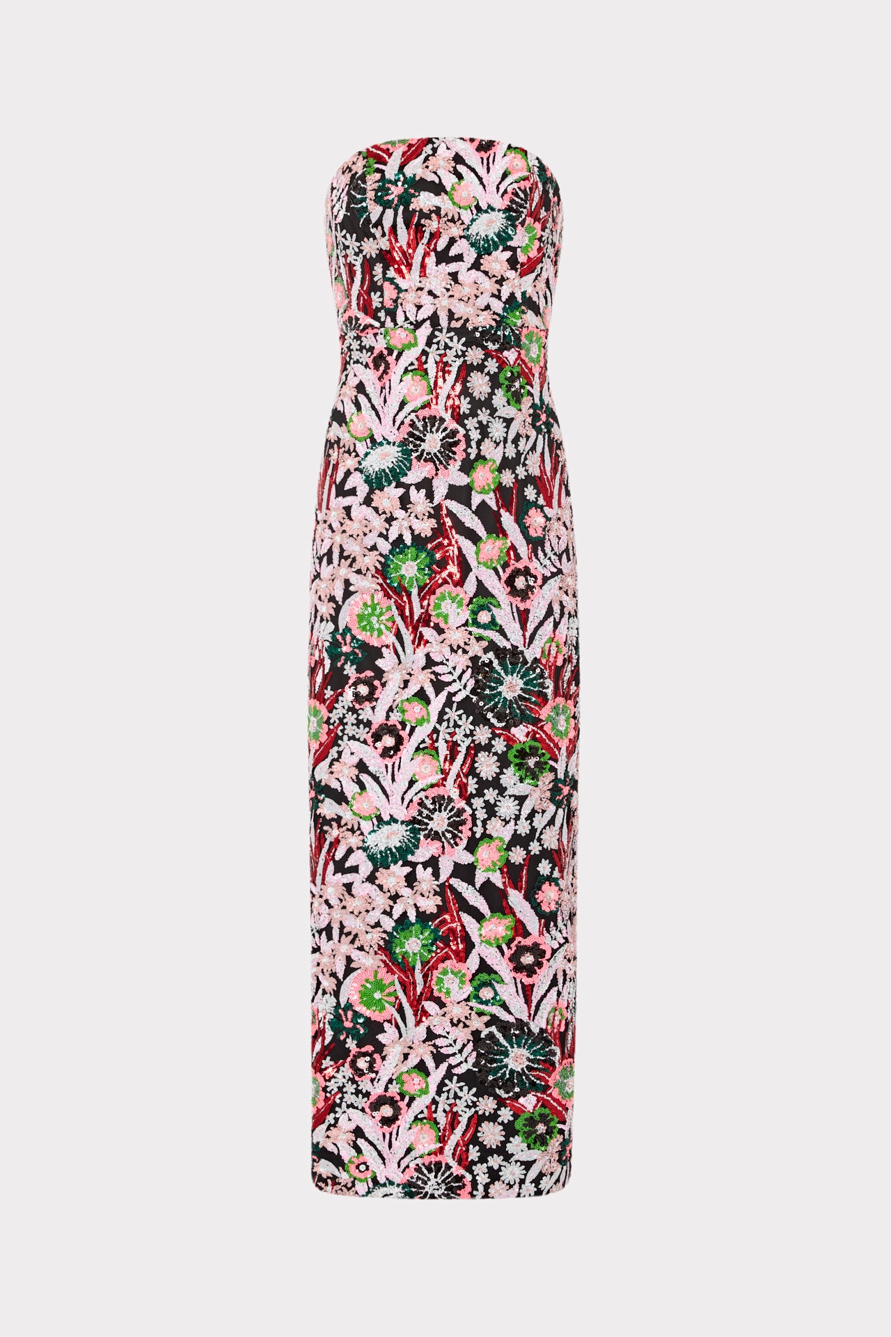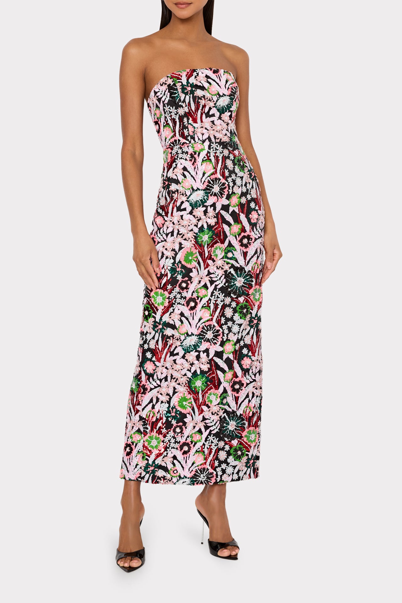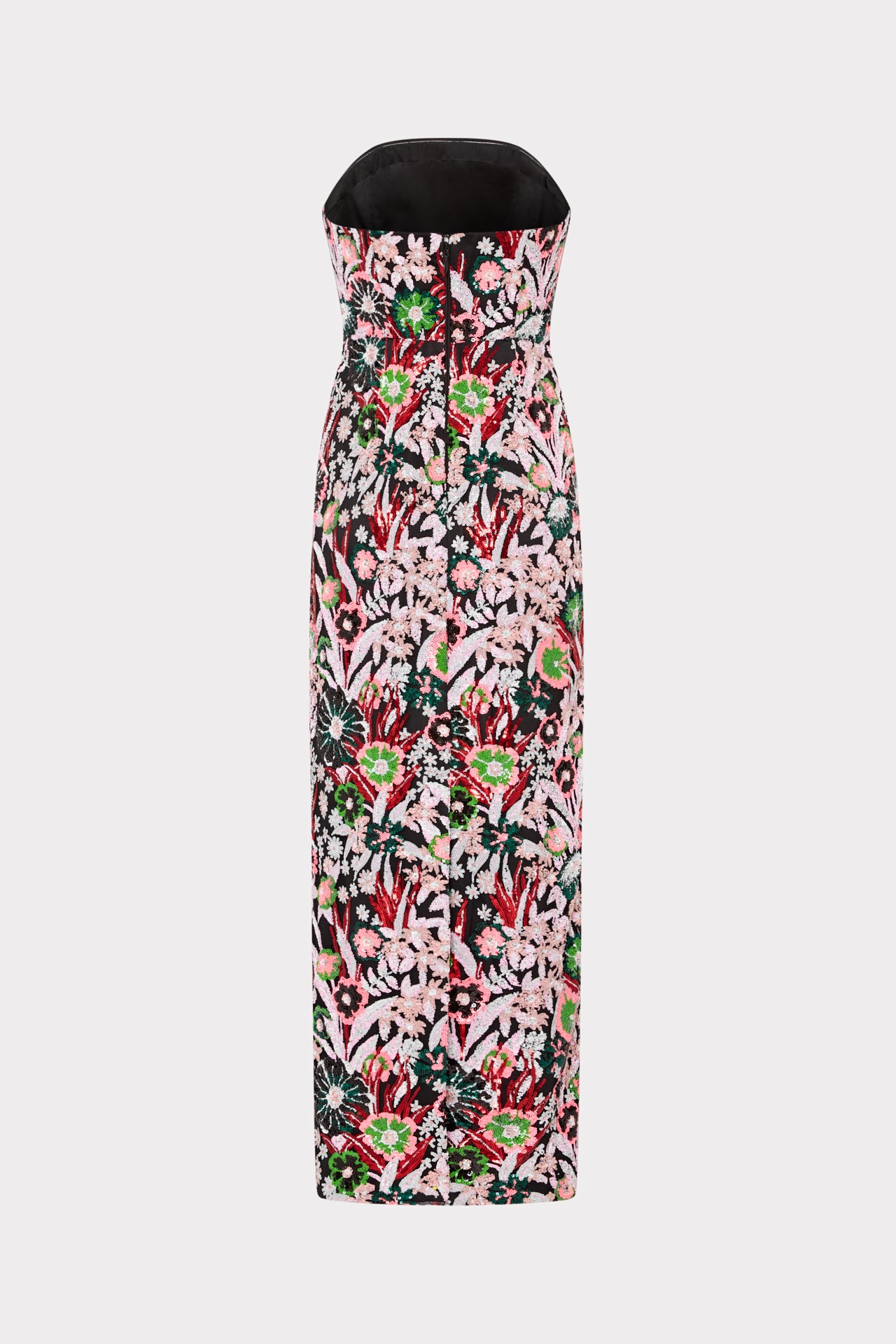 Introducing the Orion Dress, a stunning piece designed for your most unforgettable moments. This maxi dress features a strapless silhouette with boning at the bodice and a back zip for easy wear, allowing you to dance the night away. Designed with a vibrant smattering of florals and sequins, this dress is accented with an elegant back slit and non-slip silicone gripping at the chest, making it a versatile choice for formal events, vacations, and nights out on the town.