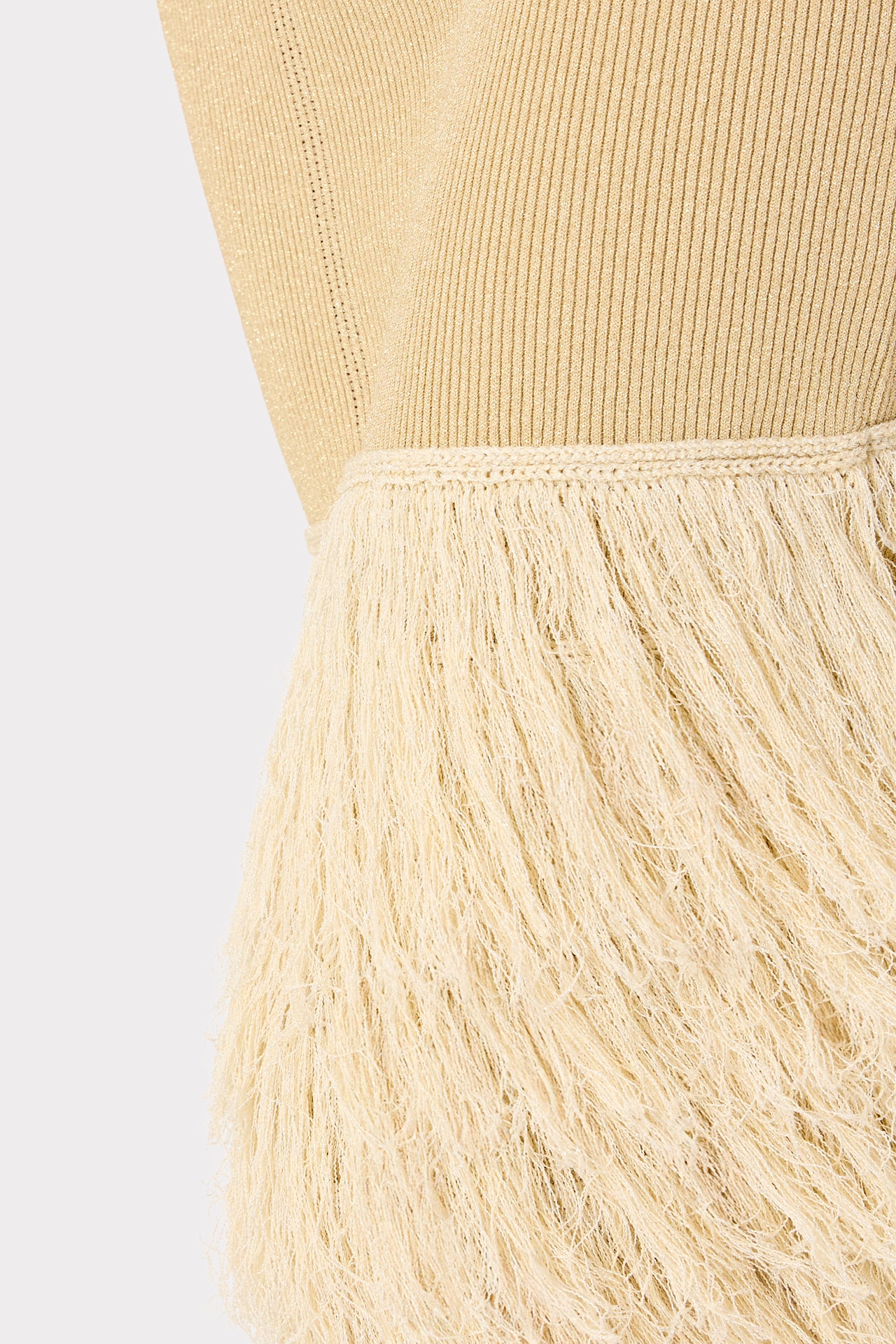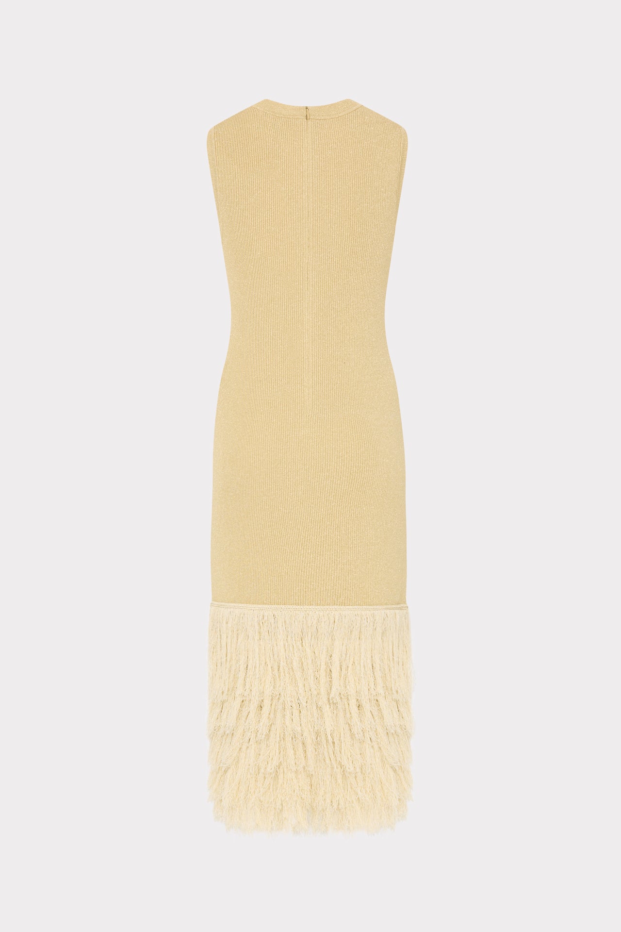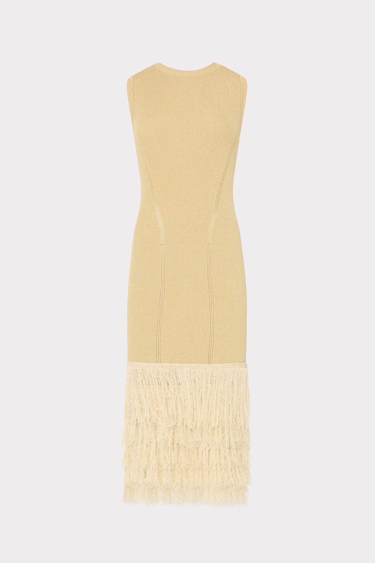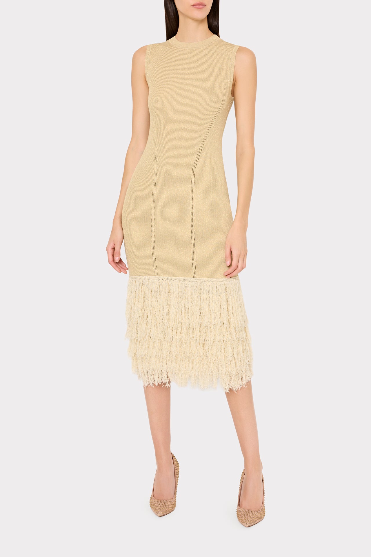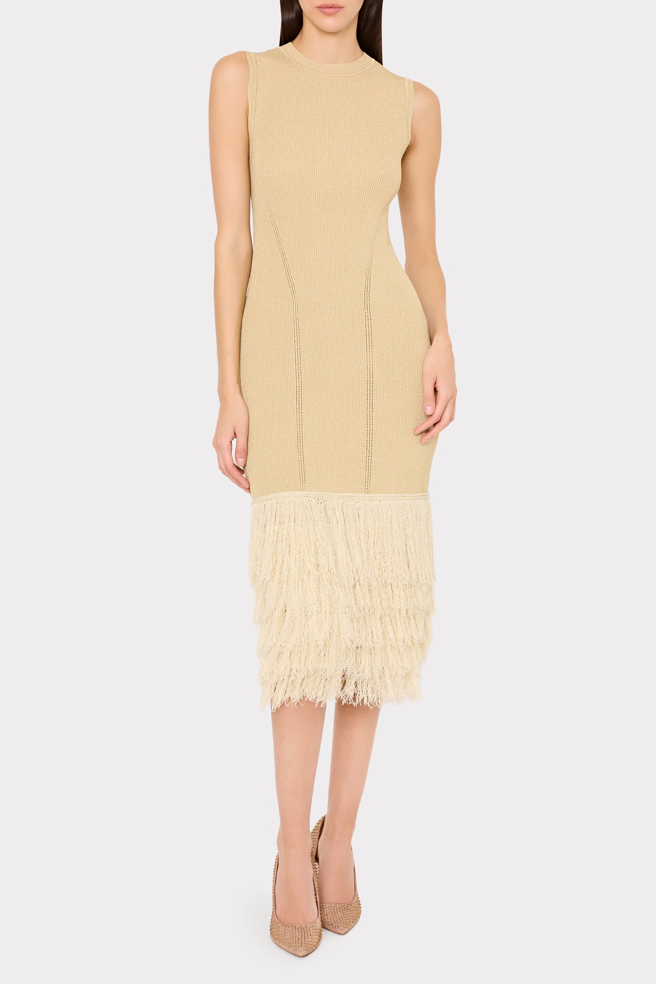 Rendered from a festive high shine metallic fabric, the Raz dress is ultra form-fitting and is adorned with a layer of fringe that begins past the knee. Stunning, comfortable, and easy to wear.