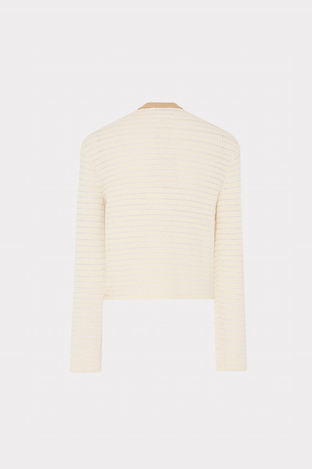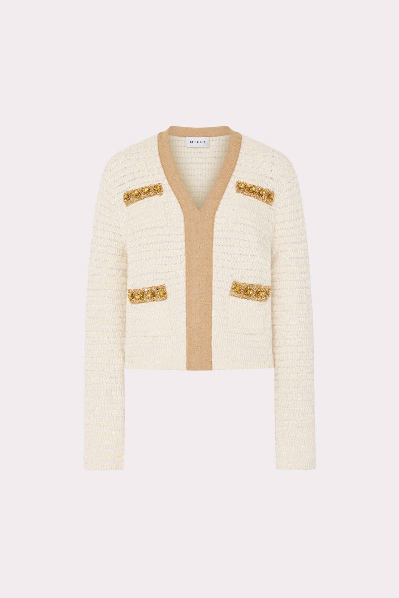 The Reid cardigan is cut from a textured woven material that’s embellished with gold trim and sequins. For the full look, wear it with its coordinating Reggie Skirt.