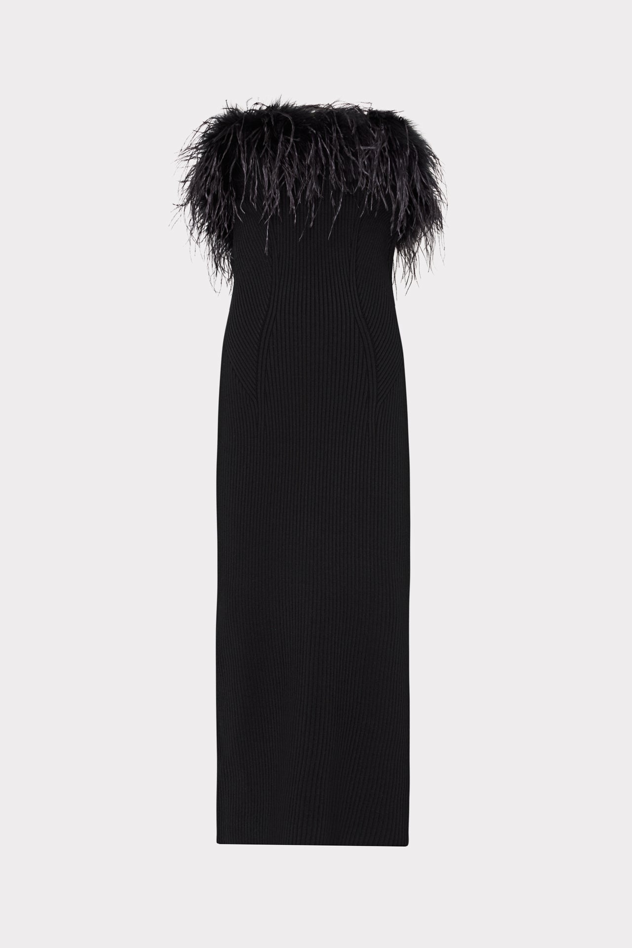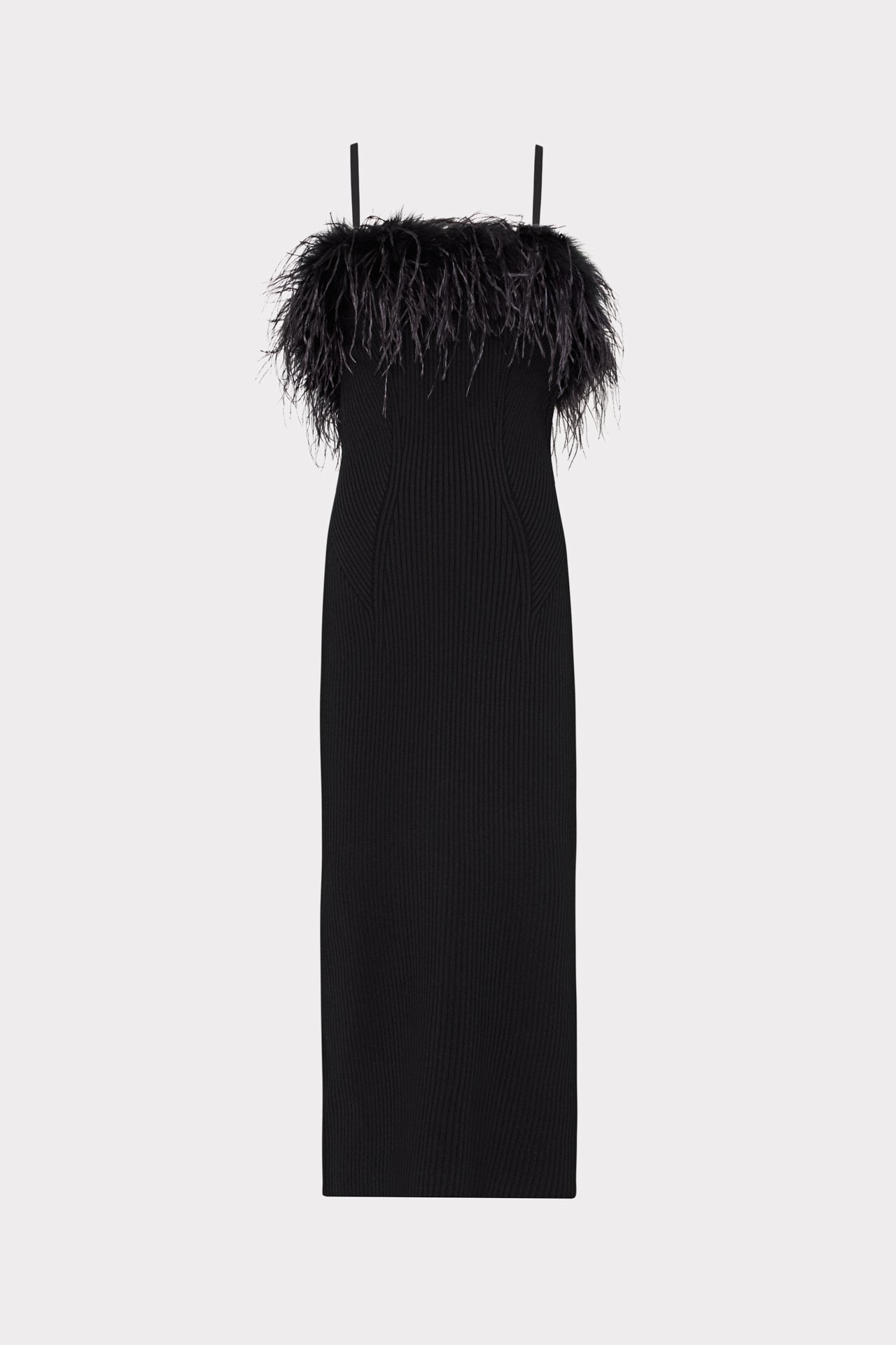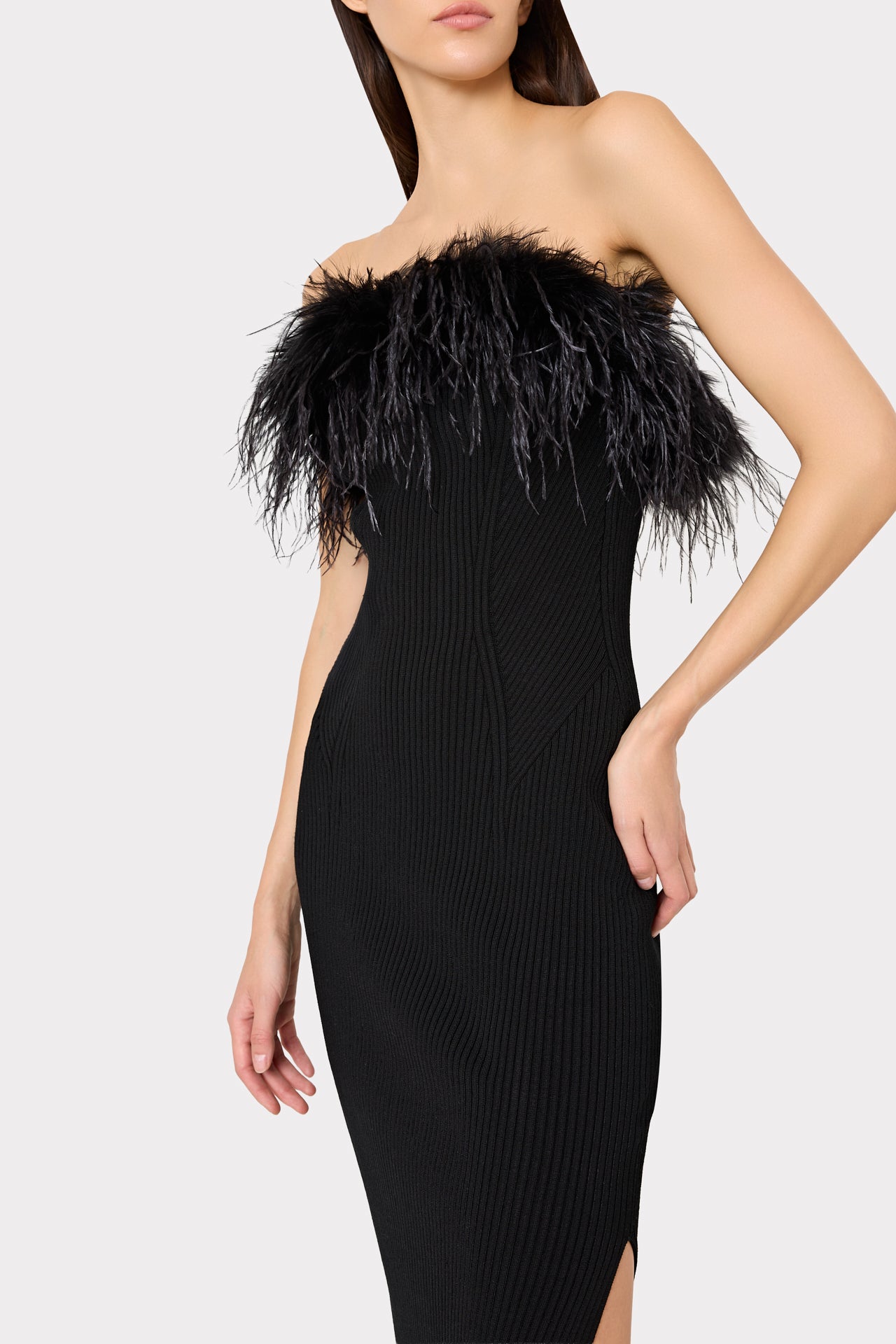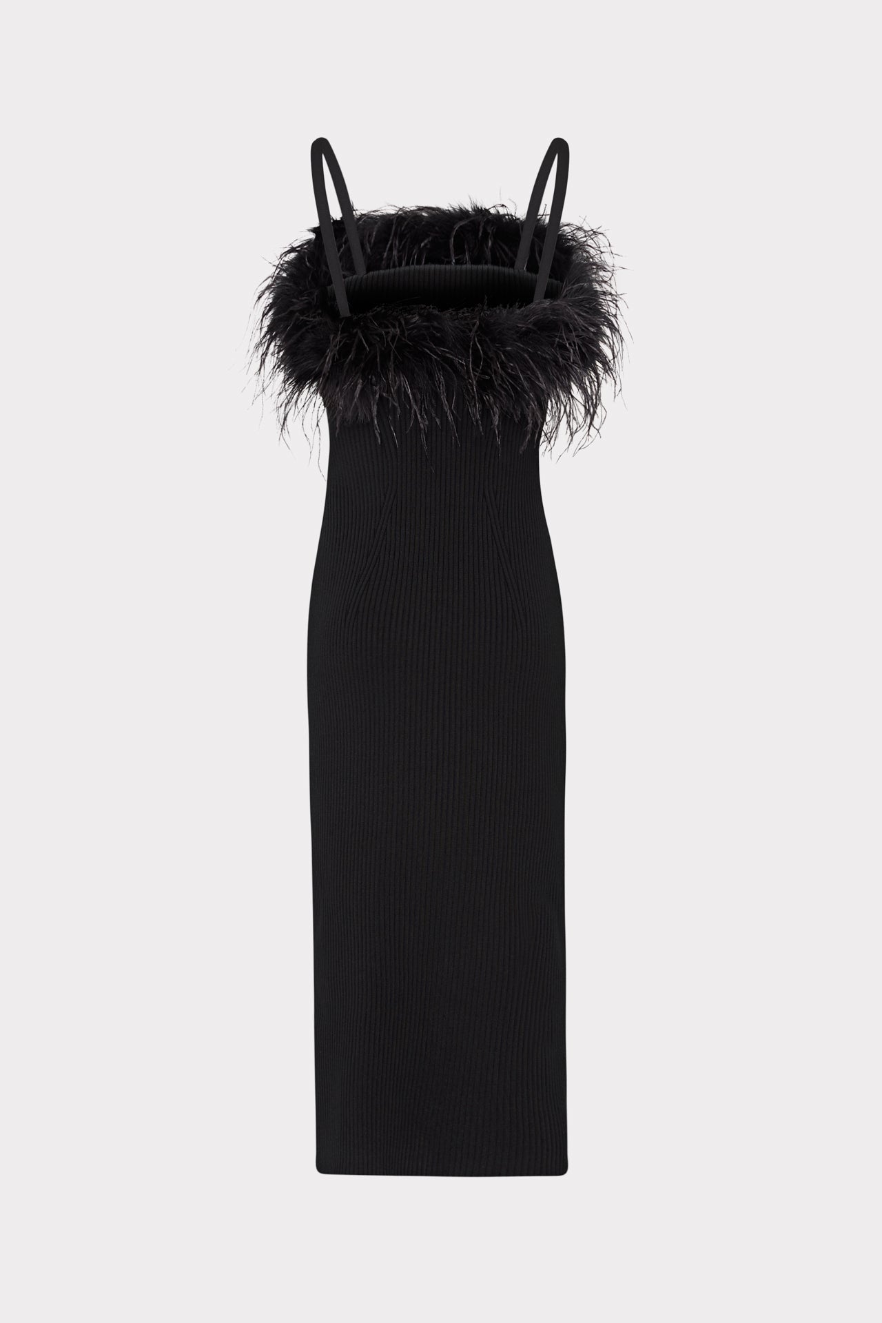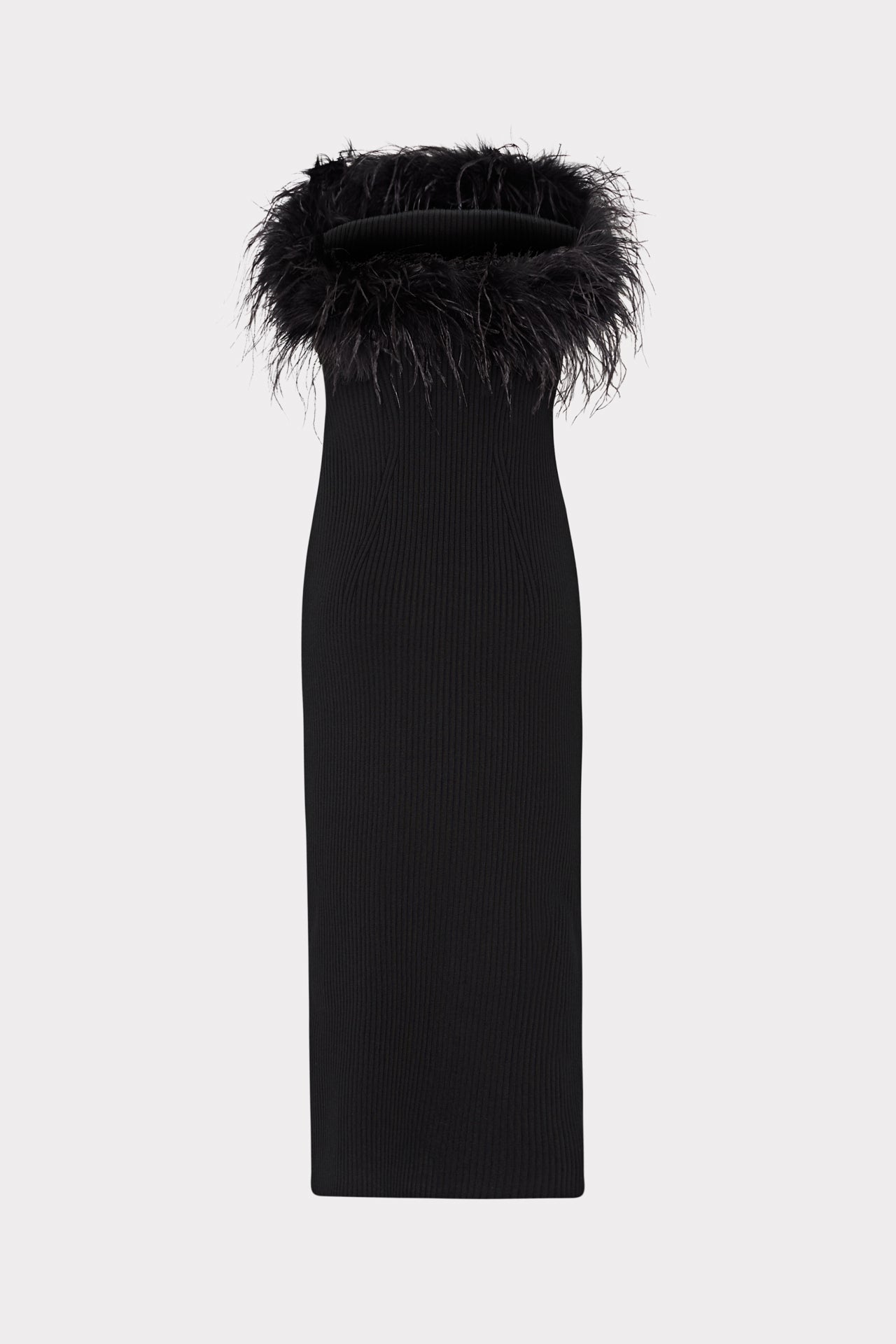 Super sultry and curve hugging, this midi silhouette is embellished with a gathering of faux feathers across the neckline. Add a pair of black heels and you're ready to party.