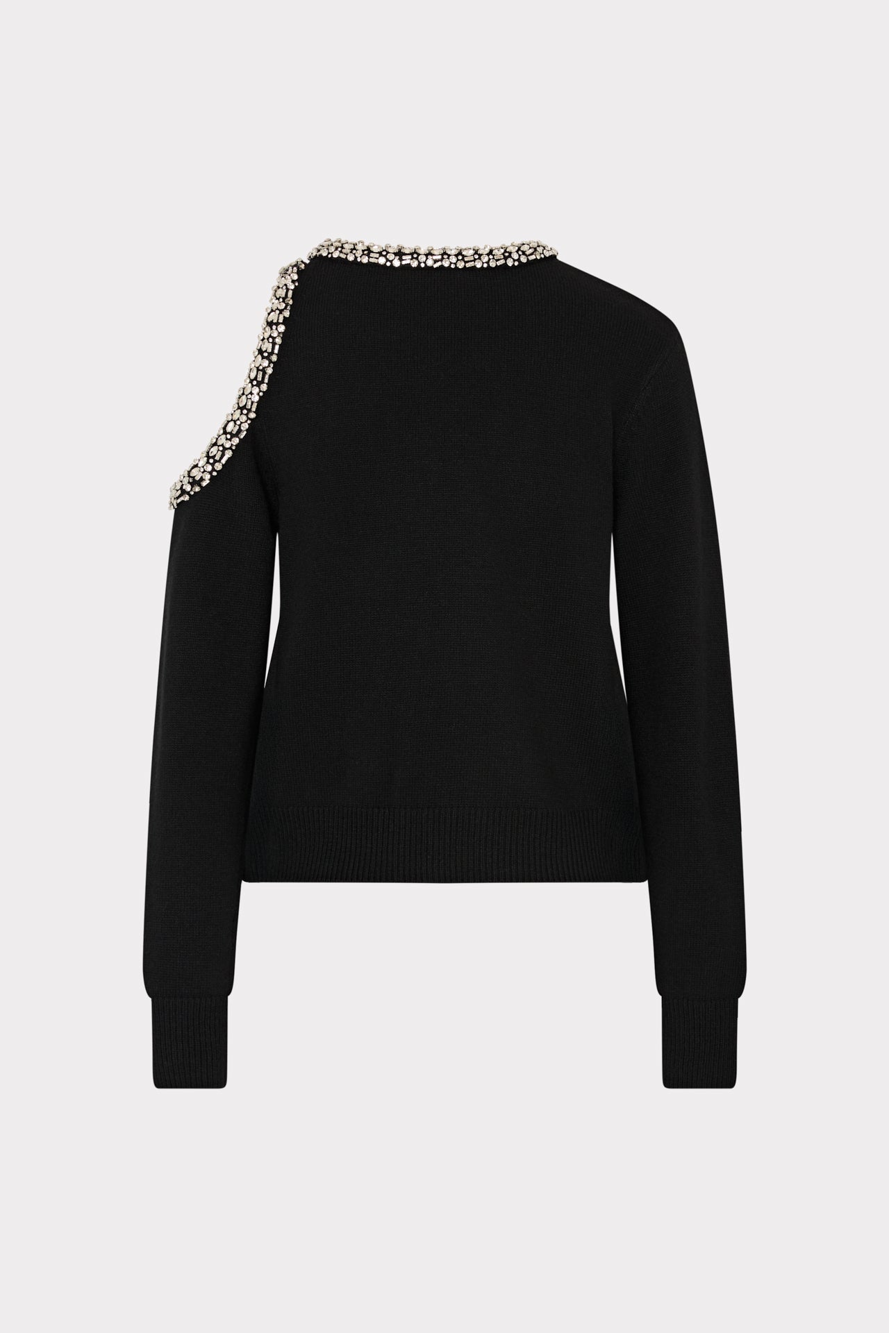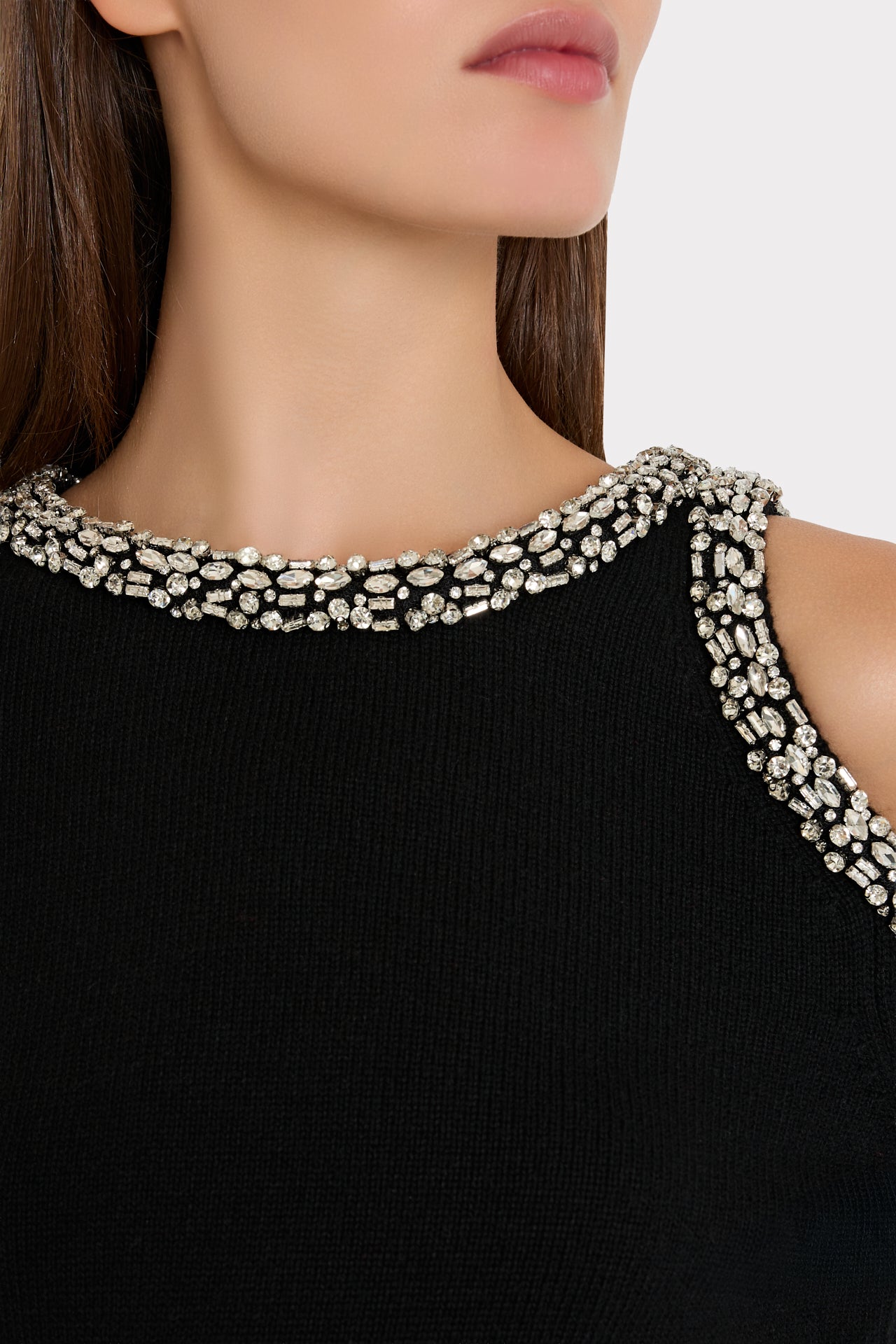 When knitwear doubles as evening wear. The Roma sweater has an exposed cutout at the shoulder that’s embellished with dramatic crystal detail. Style it with our Nash Cady Pant or our Lizzie Cady Mini Skirt.