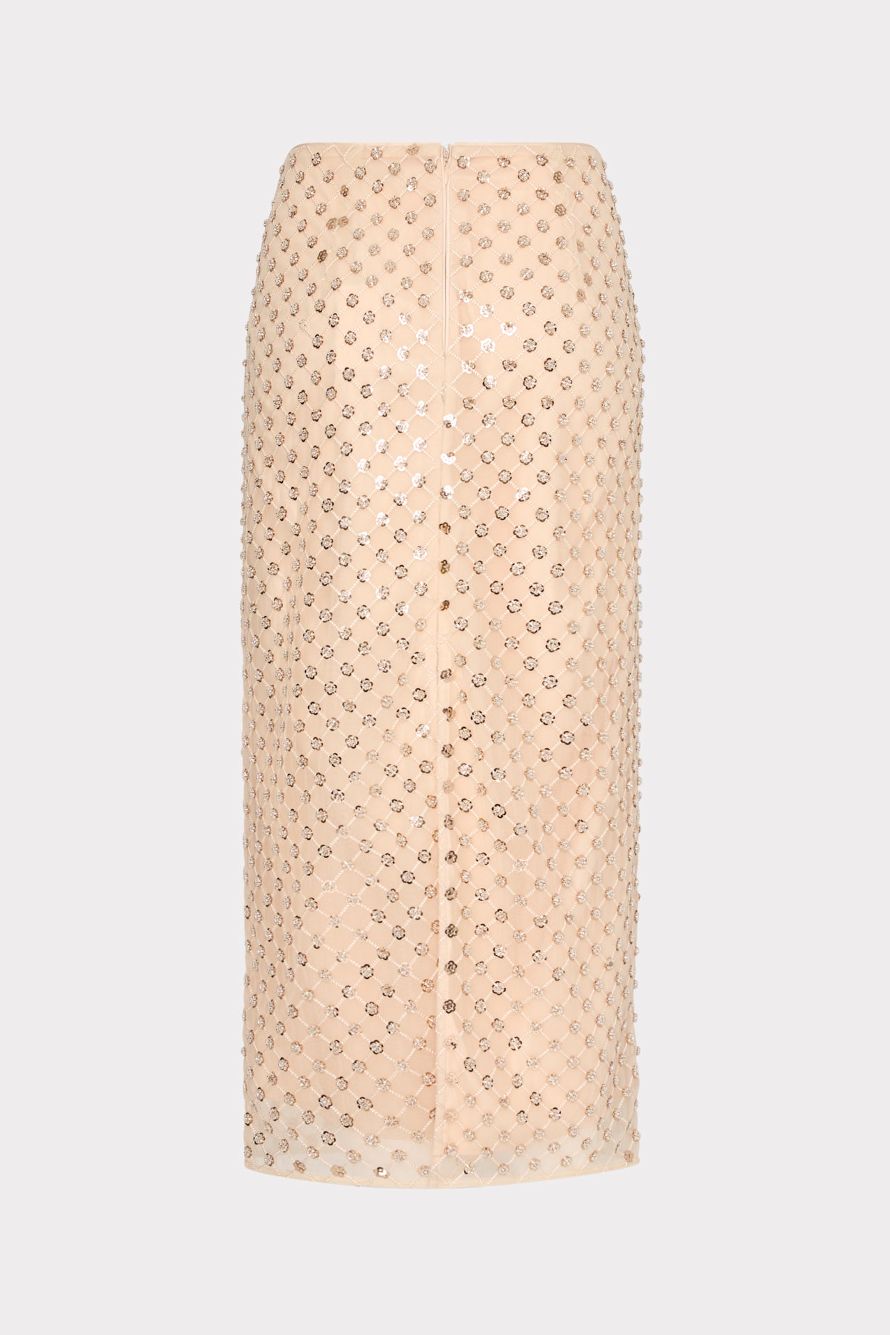 The Rosemary skirt is done in a sultry nude pencil style that falls to a chic tea length with a slit in the back. Its adornment comes in the form of a mesh overlay with sequins placed evenly throughout. Wear it with its coordinating Rylan Sequin Embroidered Tank Top.