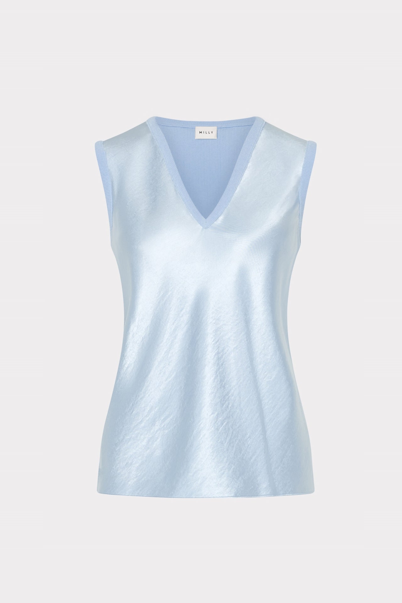 Introducing your new favorite layering piece. This v-neck tank is crafted with satin in the front and knit in the back to create a two-tone effect. Style it with your favorite MILLY separates.