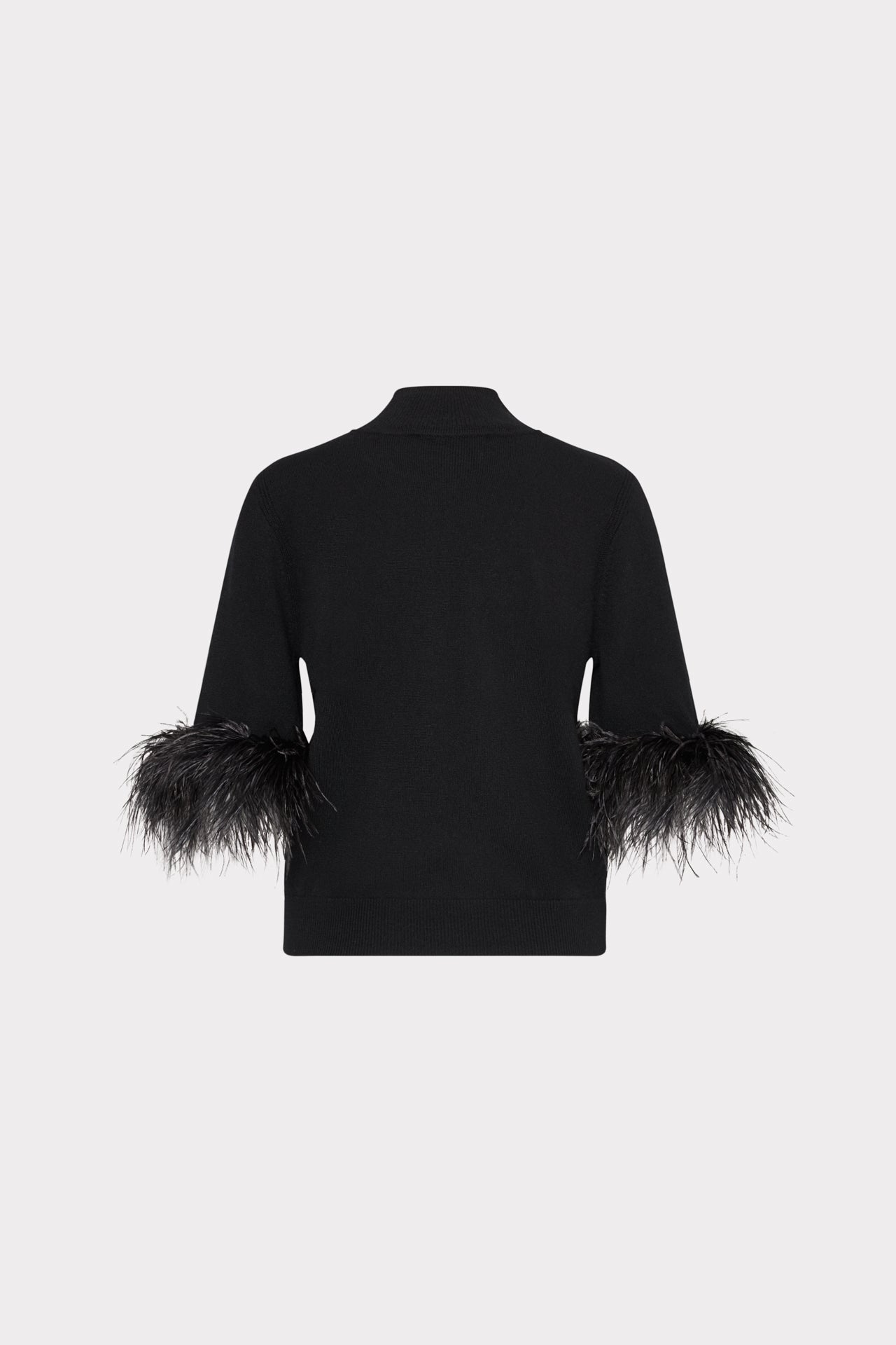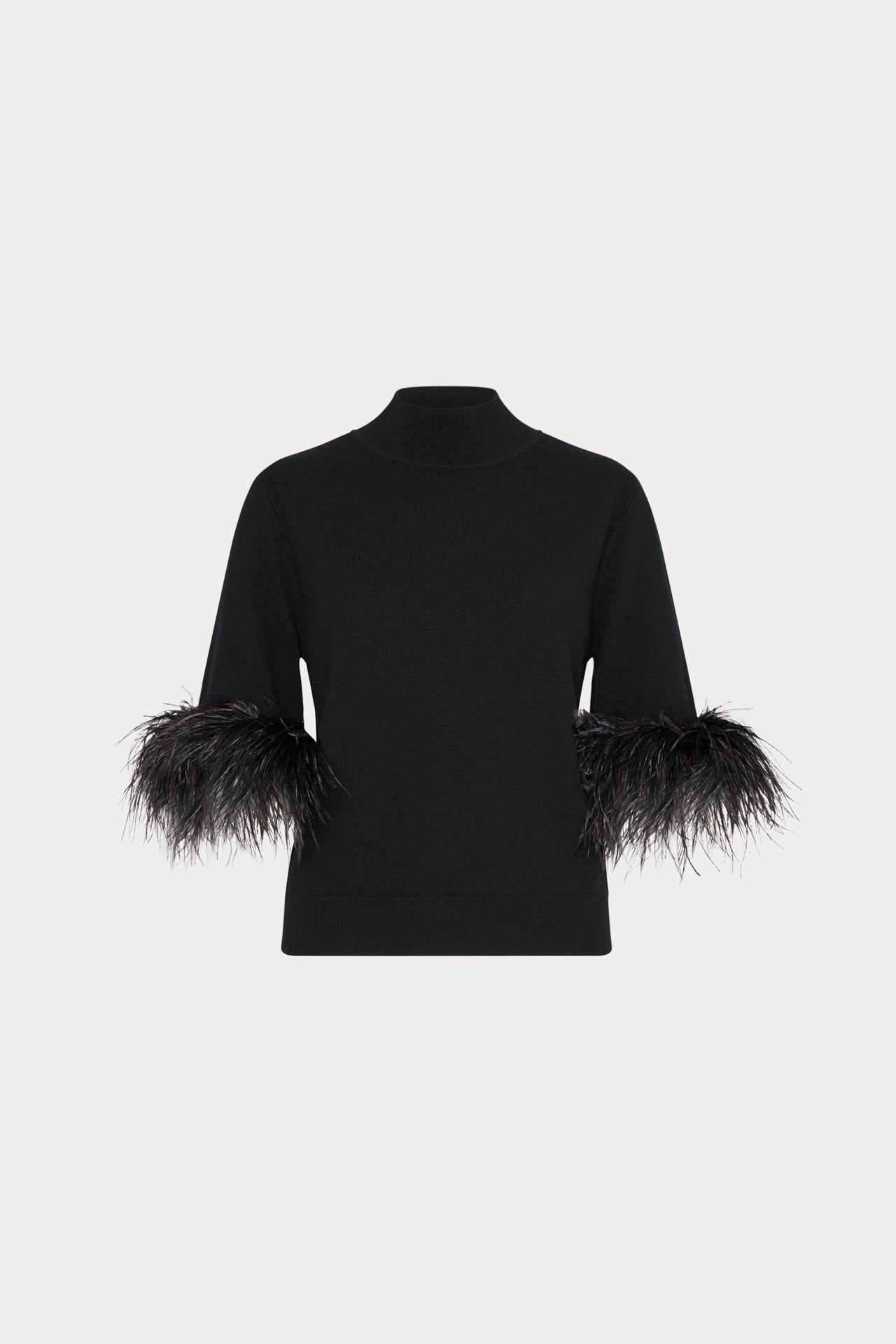 This cozy short-sleeved sweater is accented with dramatic feather embellishment. Pair it with a sleek trouser for work, or dress it up with a MILLY mini skirt for a night out.