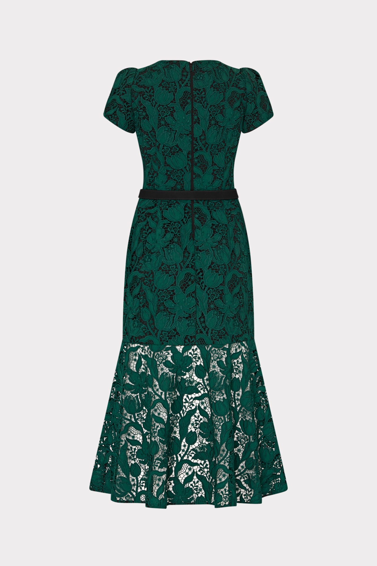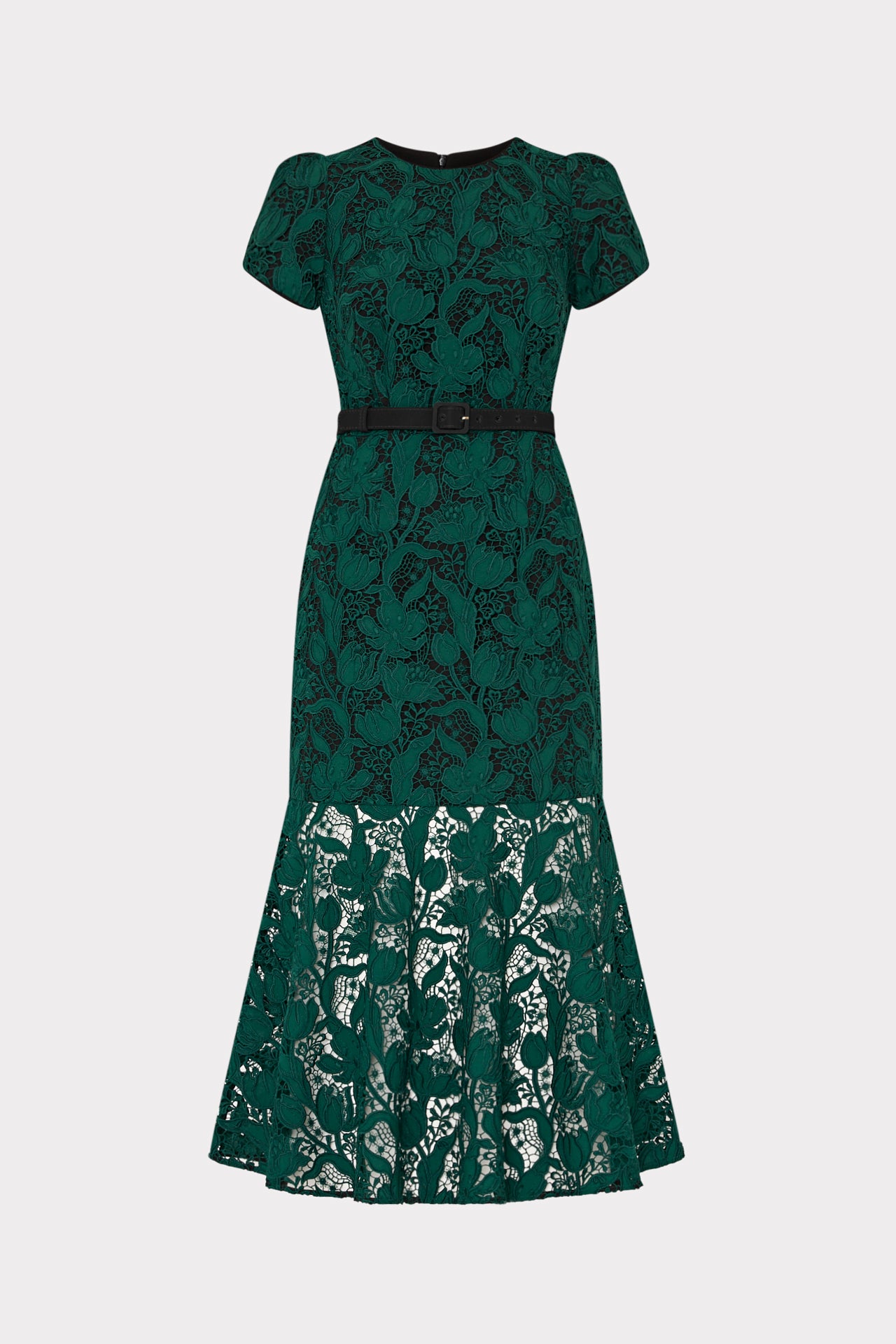 Relish in this season’s take on our signature lace dress; an elegant display of tulip garden lace florals that serve as a mesh overlay atop a short sleeve, curve-hugging silhouette that falls to a chic midi-length hemline.