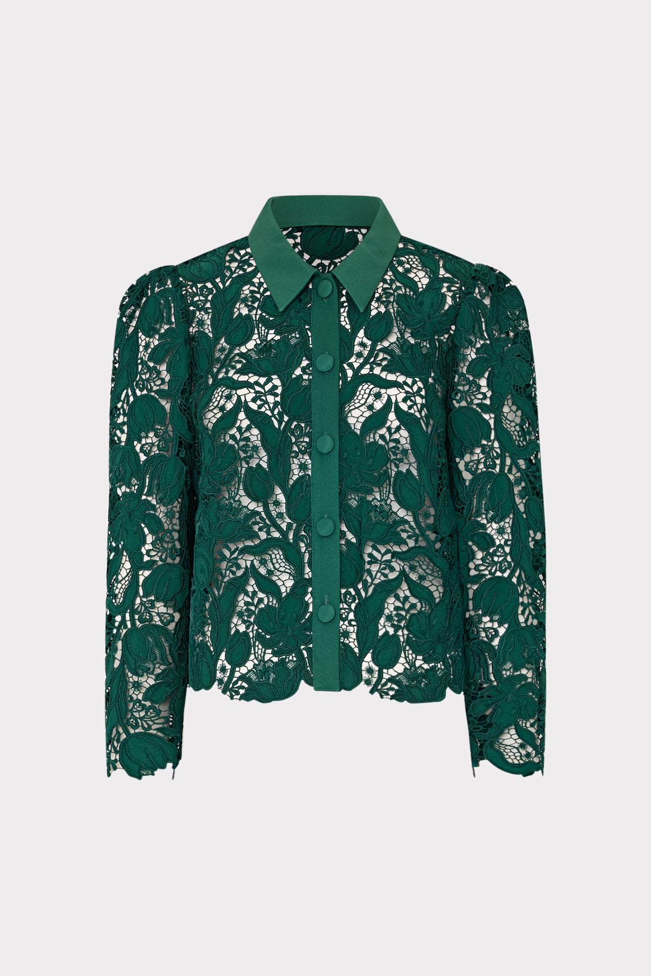 Rendered from stunning tulip garden embroidered lace, this long sleeved, collared blouse is the perfect way to dress up a simple wide leg pant or skirt. It buttons to close and is accented with zipper details at each sleeve cuff.