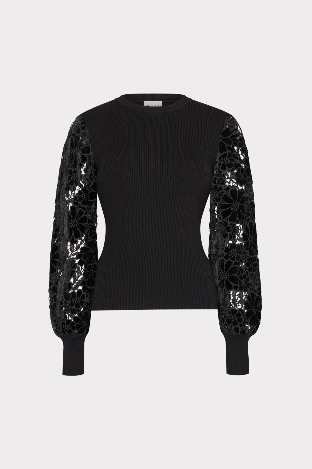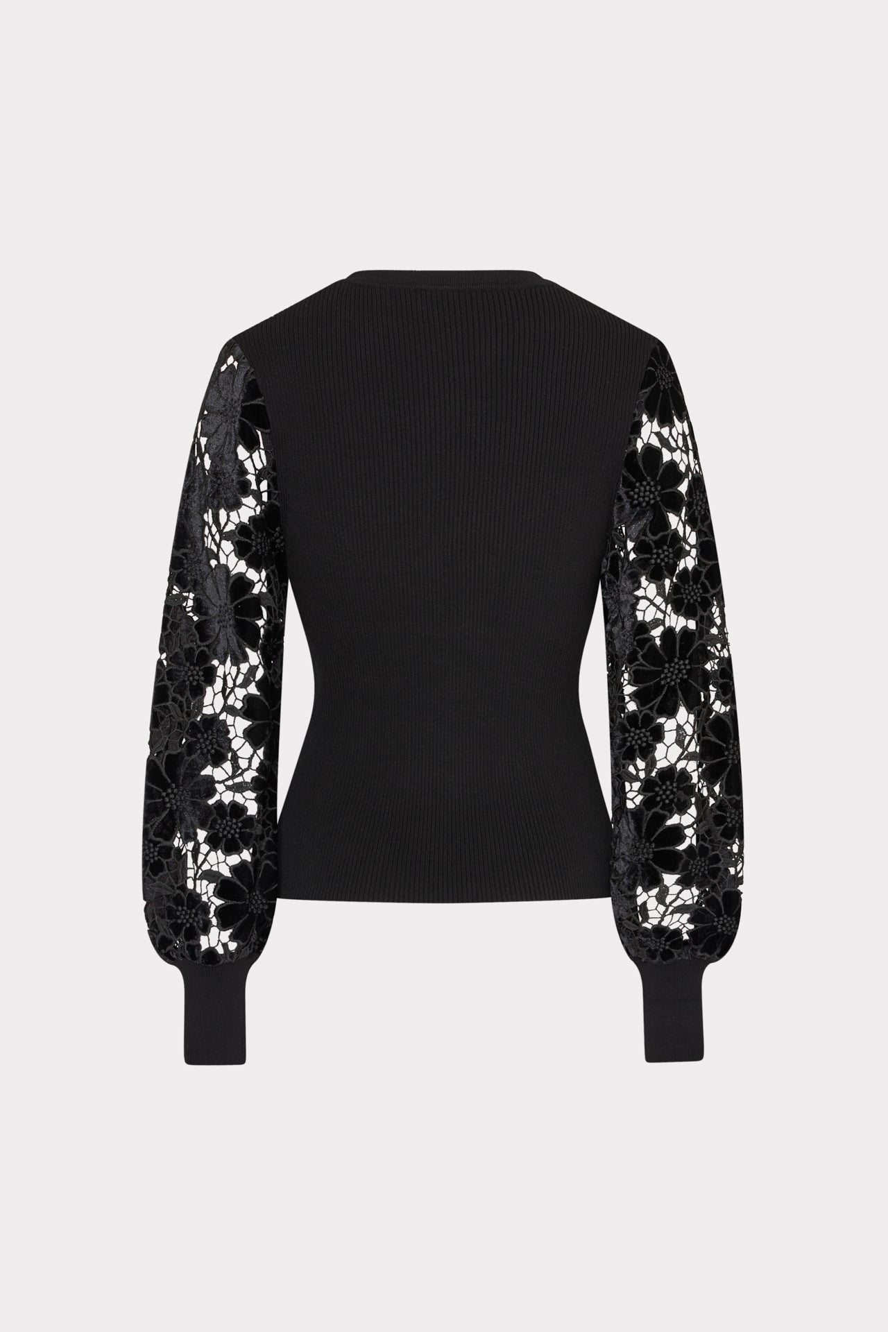 This sweater is crafted from a combination of ribbed knit fabric at the bodice and sheer, velvet embroidered sleeves for a dramatic effect. Style it with our Nash Cady Pant in black.
