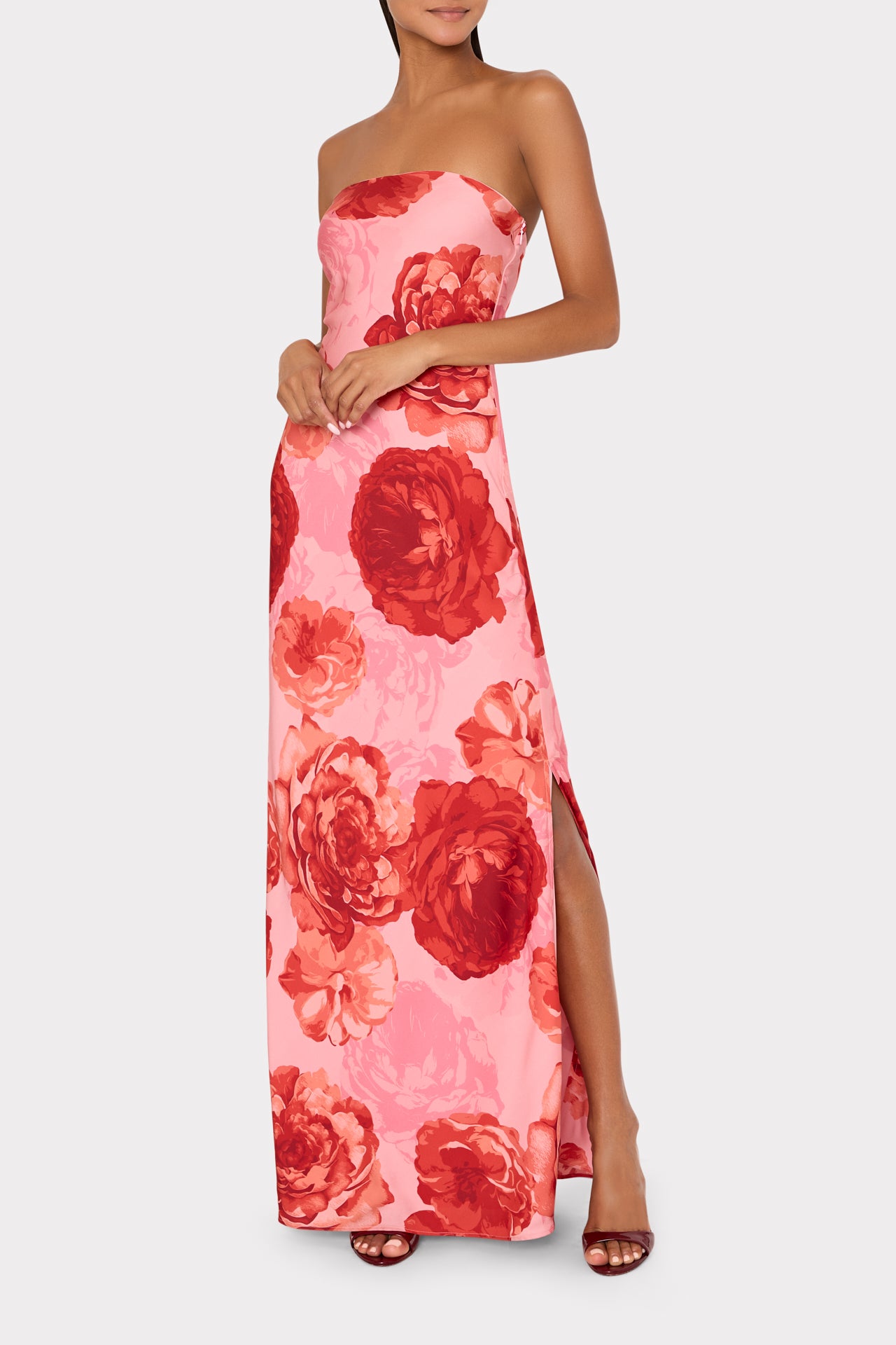 This strapless maxi dress is designed with a clean, streamlined silhouette and a subtle side slit for ease of movement. It’s finished in a bold pink and red floral print that makes a statement with minimal effort. Dress it up with heels and simple jewelry for an elegant, occasion-ready look.